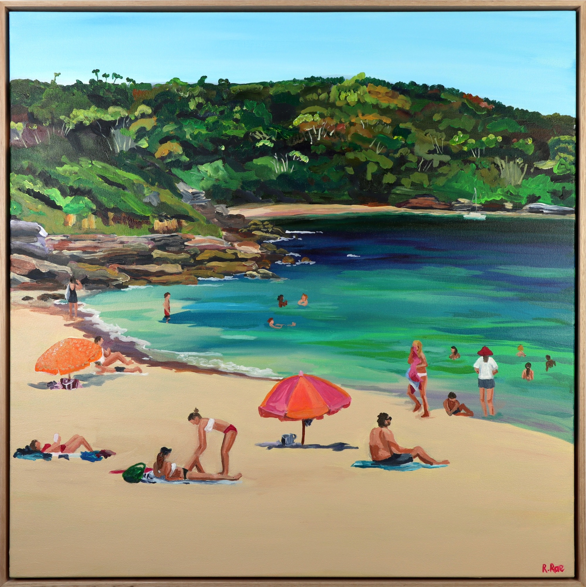 Sunkissed Serenity is an original painting by Australian Artist Rachel Rae - In this serene beachscape painting, the tranquil beauty of nature unfolds before the viewer's eyes. The horizon is adorned with the National Park, its lush greenery a testament to untouched wilderness holding history past times. Against this backdrop, a couple of vibrant umbrellas in shades of orange and pink add a pop of color to the sandy shore. The water glistens in hues of turquoise and green, inviting swimmers to immerse themselves in its refreshing embrace. A figure softened by the warm glow of the sun, emerges from the water, children play with their laughter mingling with the gentle lapping of the waves. Nearby, individuals find solace in the simple pleasure of reading, their books providing a tranquil escape amidst the sun-kissed serenity of the beach. It's a scene of harmony and contentment, where nature's beauty and human enjoyment blend seamlessly together. This original painting by Rachel Rae is painted in acrylic with a protective varnish on a deep stretched canvas, framed in Tasmanian Oak it is ready to hang.
