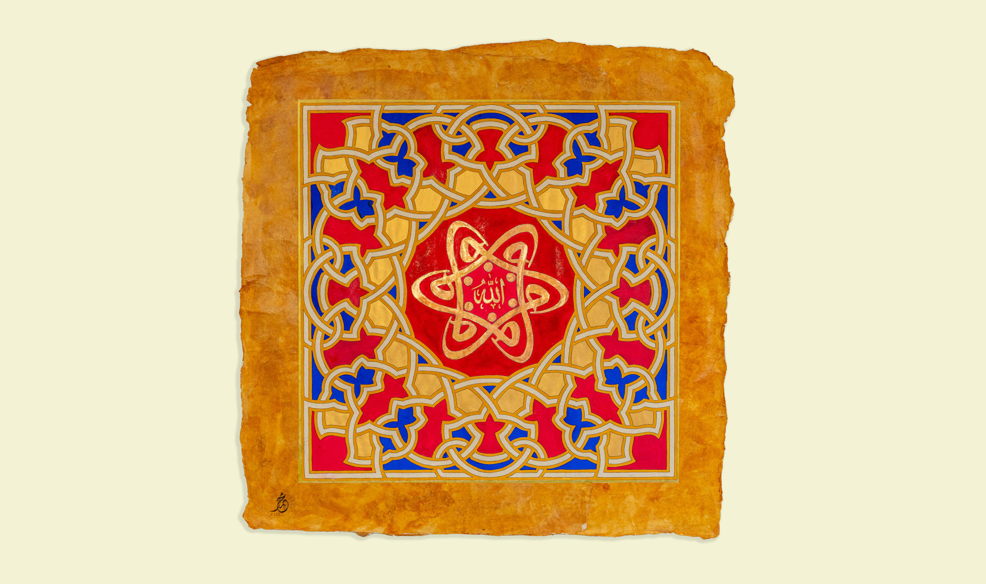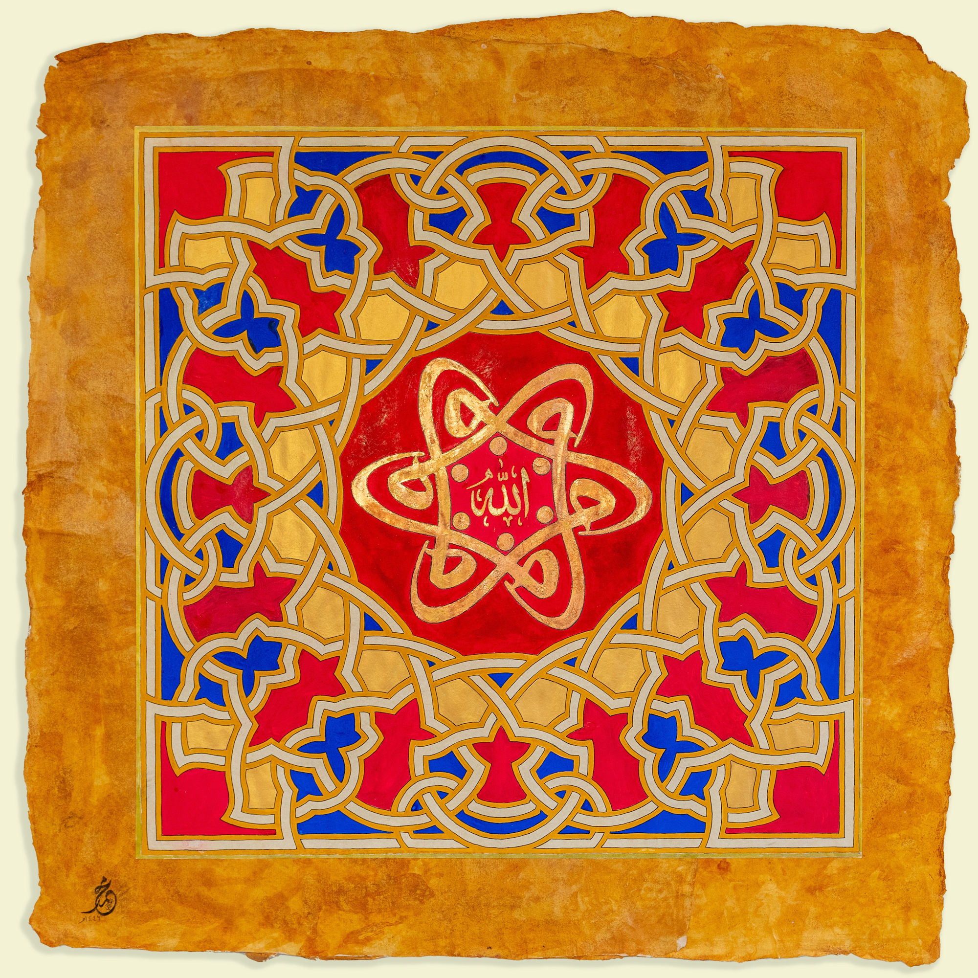 This artwork features infinite geometric knots symbolizing the interconnectedness of life and creation. Vibrant red, blue, and gold evoke harmony, while the central calligraphy of Allah’s name anchors the composition as the axis of existence. Each knot reflects the bond between creation and Creator, inviting a meditative exploration of unity and multiplicity.