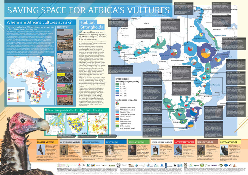 Habitat Info together with Savage & Gray Designers produced an eye-catching poster summarising the principal outputs of the African Vulture Hotspot Mapping Project. Design costs were covered by The Peregrine Fund and Wangeningen University. The poster provides a practical tool for conservationists seeking to locate their interventions to be of maximum benefit to vultures and it helps promote awareness of the threats vultures face with the wider public.