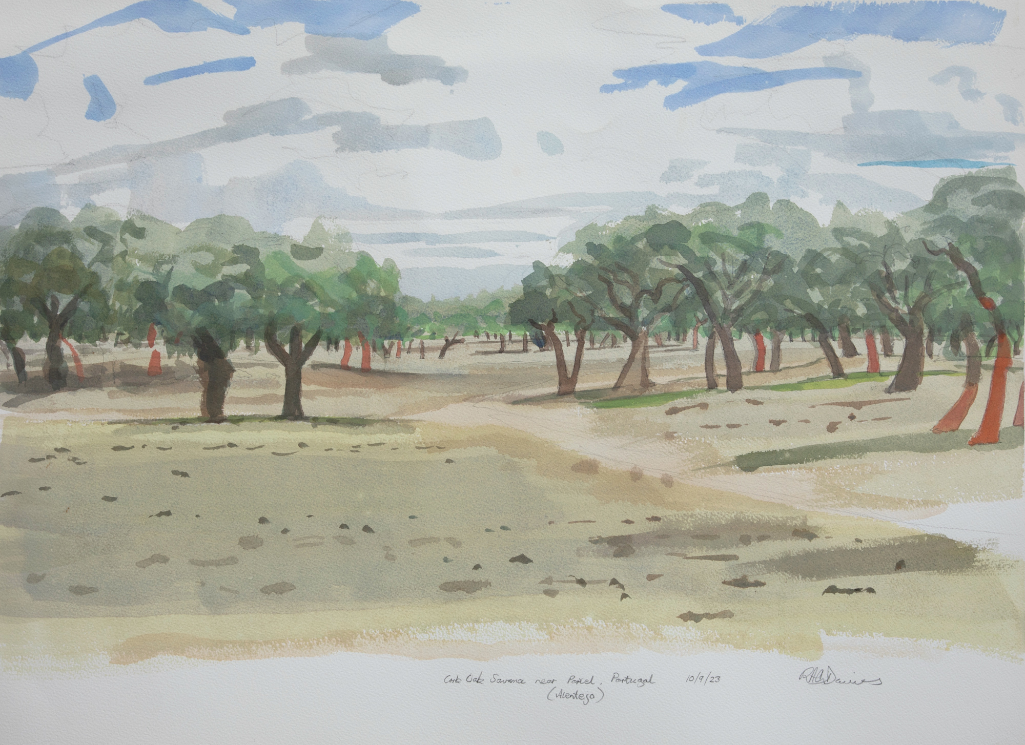 This was a lovely open patch of Cork Oak savanna on our first venture into Alentejo, the 'wild outback' of Portugal. I felt such a relief as the landscape changed, becoming more arid and filled with fantastic trees the further East we drove from Lisbon. The Cork Oaks seem to grow in obvious patches, especially where the ground seems raised and more rocky, a broken terrain. Heaven for birds of prey and other wildlife and we met our first Iberian magpies not far from this site. While I sketched, Mandy enjoyed the Hoepoes and larks foraging and singing nearby. Natural habitats such as these sound different from the more man-made landscapes further north. They are alive. Not just birds but botanically rich too. It may look like bare ground under the trees but as many as 135 species of vascular plants have been recorded in one small patch (about 30 x 30m) in a study area of Cork Oak woodland in Andalucia which is one of the highest known plant diversities in the world at this small scale. So it is fortunate that much of these woodlands are protected in Spain and in Portugal either by EU, the State or the landowners who rely on their produce. Even when their bark is harvested as cork, these trees are beautiful with their bright red tree trunks.