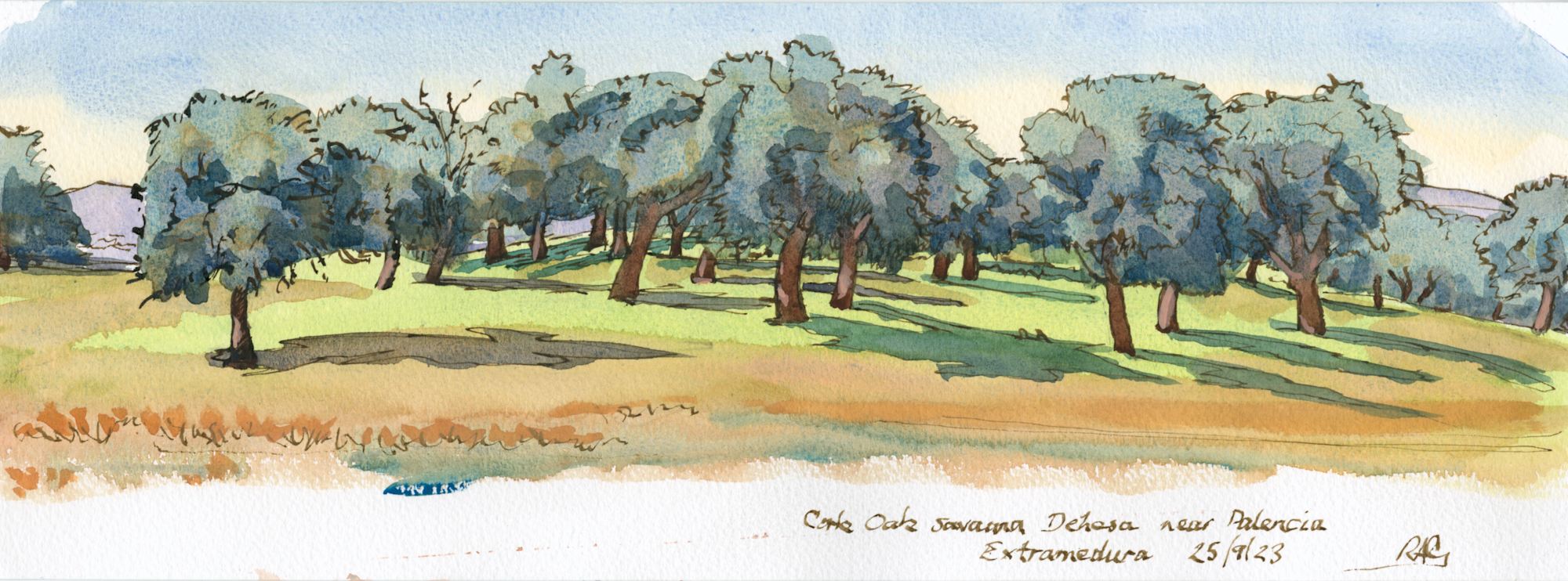 I love the way cork oak trees lean out at different angles, especially on top of a slight mound like this. After the rains there are patches of bright green vegetation growing beneath the trees, so reminiscent of camelthorns in the Kalahari. Always a richness of birds and bird song around these trees. I think we saw an adult Spanish Imperial Eagle soar off to great height in the distance. Sketched these to a backdrop of Wood Larks and Thekla's Larks calling and displaying.