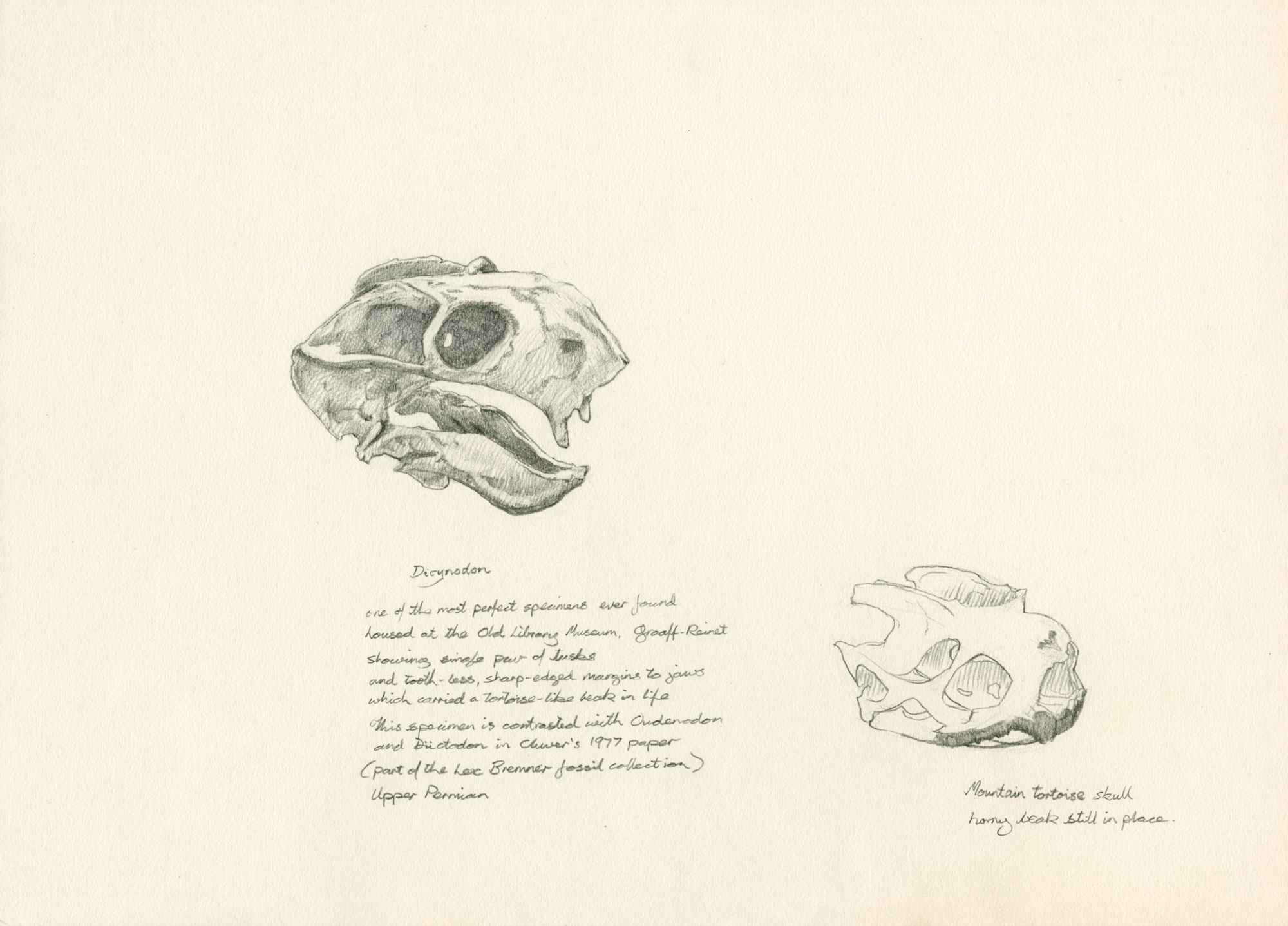 Dicynodon. One of the most perfect specimens ever found, housed at the Old Library Museum, Graaff-Reinet. Showing a single pair of tusks and tooth-less, sharp-edged margins to jaws which carried a tortoise like beak in life. This specimen is contrasted with Oudenodon and Diictodon in Clewer's 1977 paper (part of the Lex Bremner Fossil Collection) Upper Permian. Mountain tortoise skull, horny beak still in place.