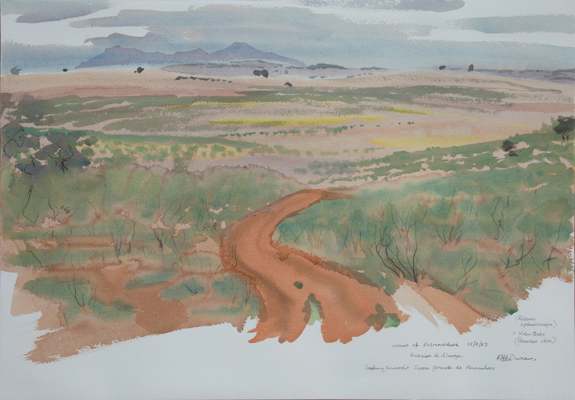 Sitting out under the Holm Oak we camped under, with the art board and my rather out-of-place office chair, it was an ideal spot to stretch a large piece of Arches watercolour paper and try to capture the textures and soft colours of this part of Extremadura. I started off with the paper quite wet and let the colours drift into one another rather like the vegetation does here. The rough texture of the Not pressed paper helped with the distant scrubbiness. It was just so nice to find the purples of the Sierra Grande de Hornachos in the distance, reds of the bare earth and the soft grey greens of the spikey Retama sphaerocarpas that surrounded me. Arid lands just seem to suit my palette so much more than higher rainfall areas! We saw a few vultures, the harriers and listened to the larks around us.