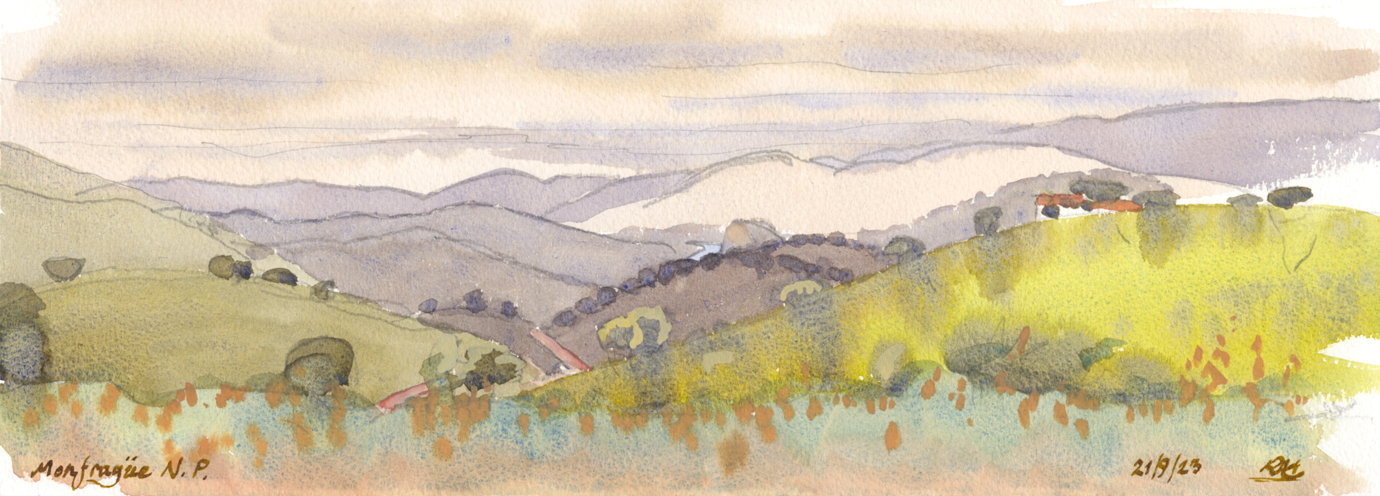 This is the view from the little village, Villarreal de San Carlos in the middle of Monfrague National Park looking East across the park on one rainy afternoon. You can see a sliver of the dam that snakes through the park and the wonderful staccato silhouette of oak trees lining the hill tops.. great habitat for Bonelli's Eagles and Black Vultures which can be seen clearly from the roads. This little national park in Spain is the closest equivalent in Europe to a game reserve experience in Africa. Lots of Red Deer everywhere. Hunting has been permitted in parts of the park which is why they know Iberian Lynx occur here because one was treed by dogs recently. There has been a public outcry to stop hunting in the park.
