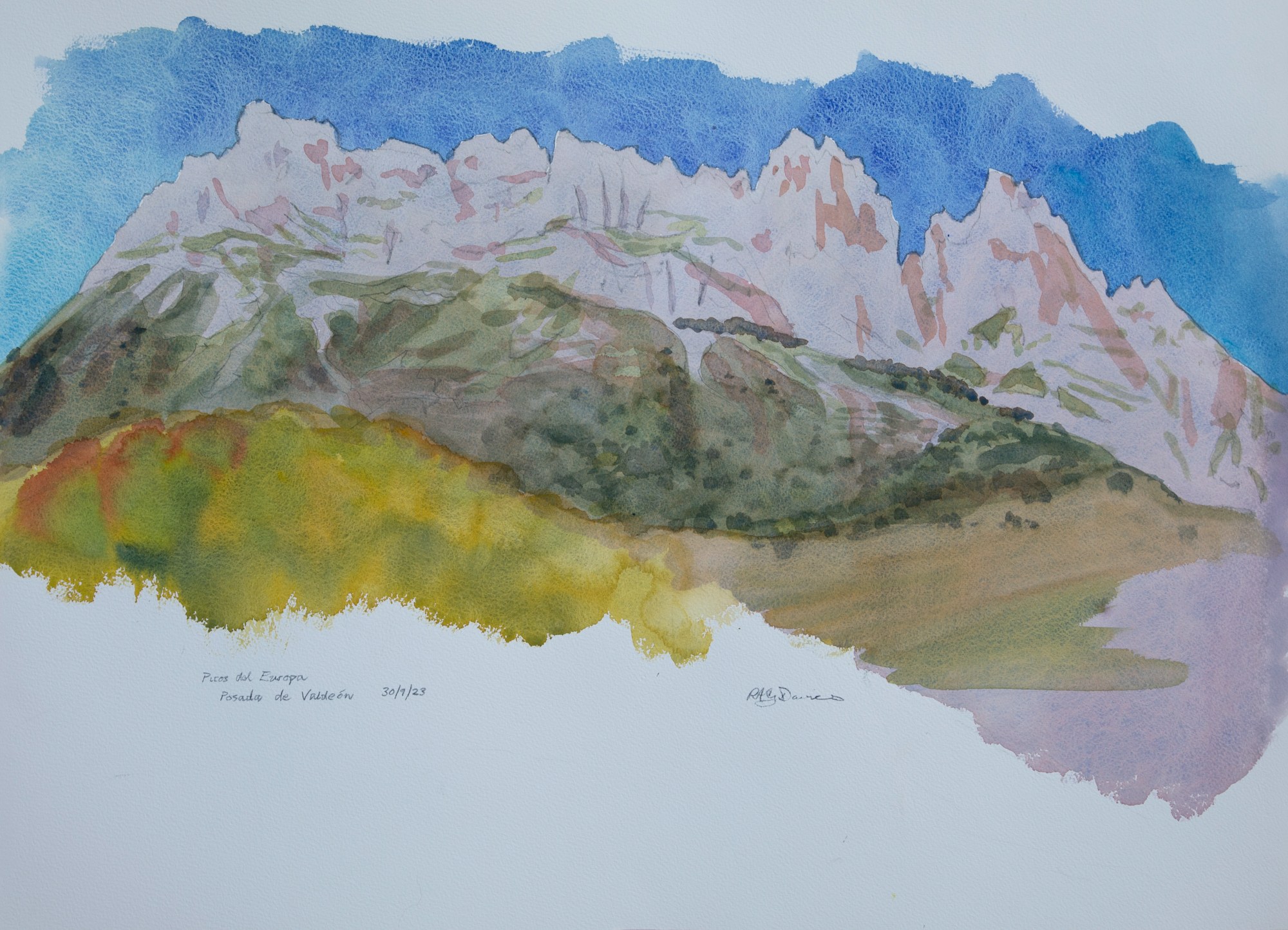 I just love the stark contrast of the white pinkish limestone peaks of the Picos against the fantastic deep blue sky. These are fairytale mountains very wild in their inaccessibility. A Buzzard was calling from the trees in the foreground. After the sketch we did a drive along the Cares Gorge as far as we could, which cuts through the wild heart of the Picos. It is renowned as one of the most dangerous roads! We camped in a really secluded spot. We saw plenty of Alpine Choughs, Ravens and Griffon Vultures around the cliffs and in the evening a Chamois appeared with its youngster.