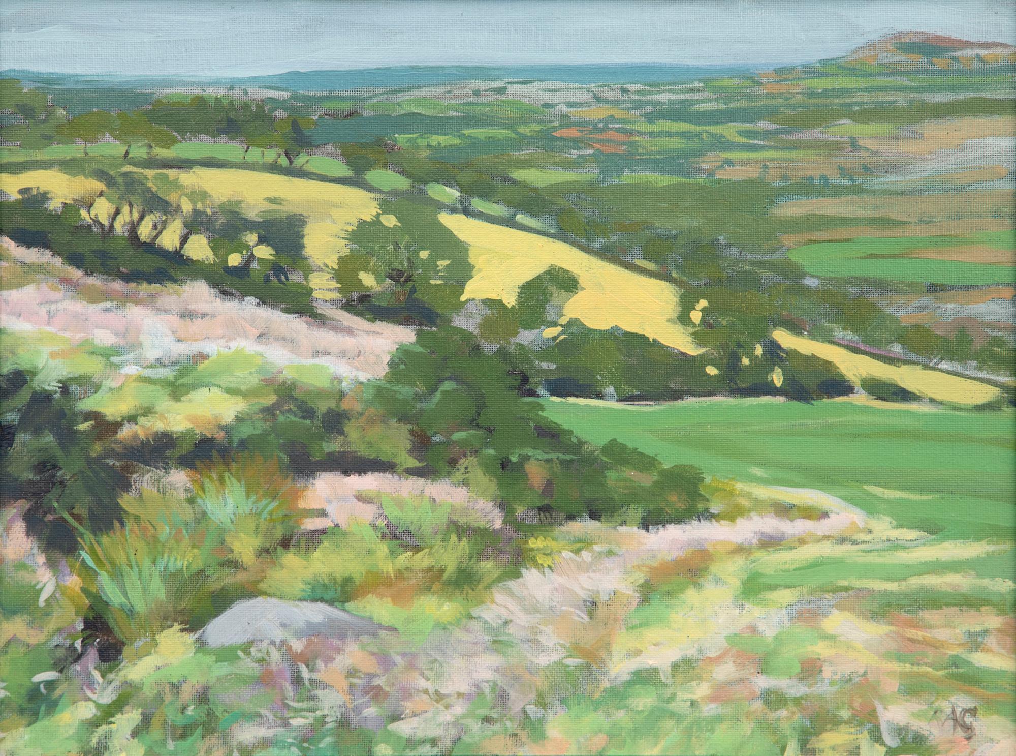 This is an original oil painting 40 x 30cm on canvas board in a golden frame. It depicts the view over Brynberian Valley from high on the Preseli Mountains at the Waun Mawn standing stones. I enjoyed the arrangements of the wind-formed leaning trees and the wind-blown grasses with the divided landscape beyond.