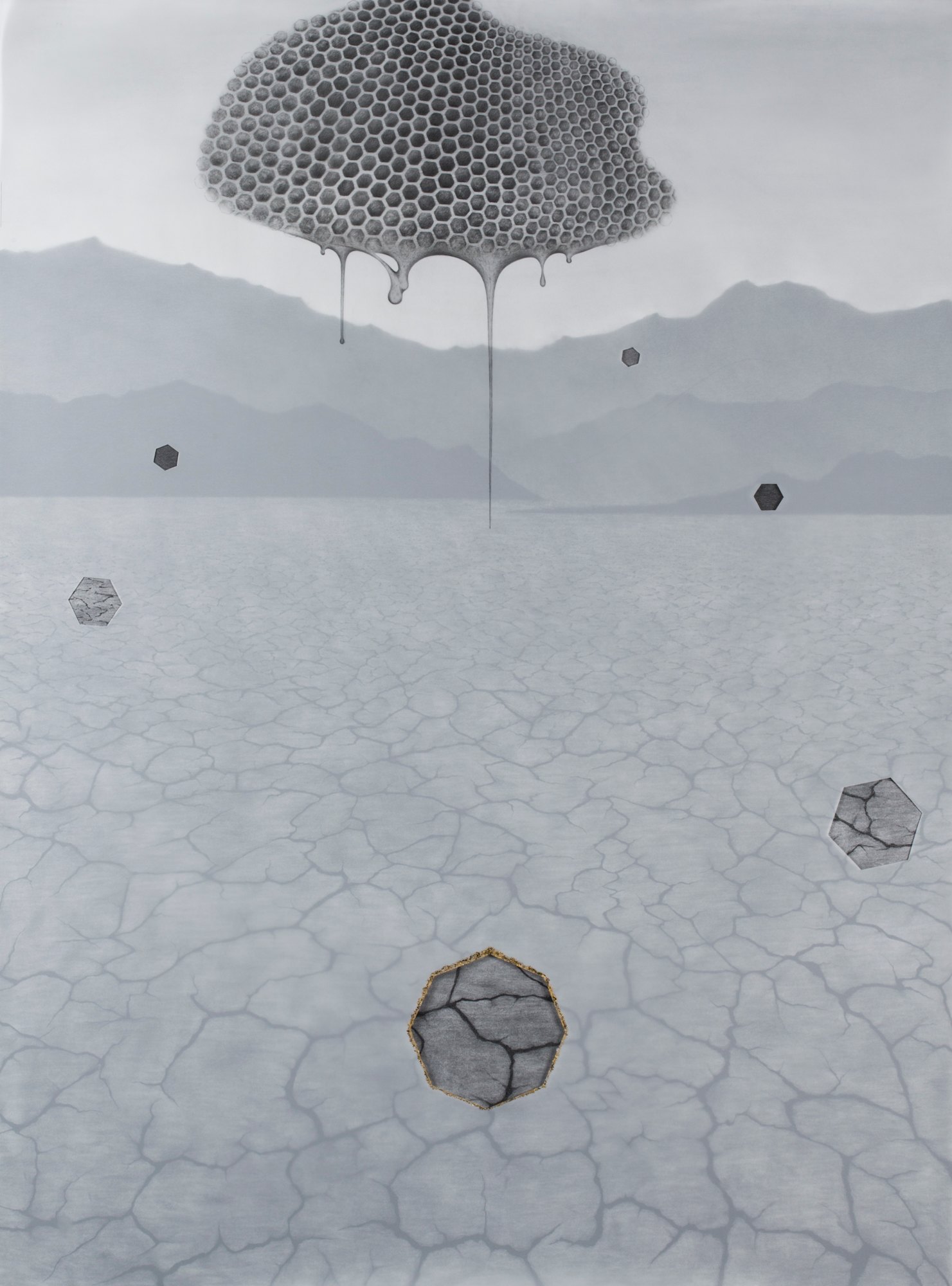 Like anyone who gardens, I subconsciously depend on the pollinators busily working to assure continuity. Drought deepens with time, and I feel the parched land under my feet. Searching above for a rain cloud, my mind’s eye superimposes an engineered remnant from the insect world. Like a depleted cloud, it drips dry to form one last gold-rimmed portal to the next chapter.