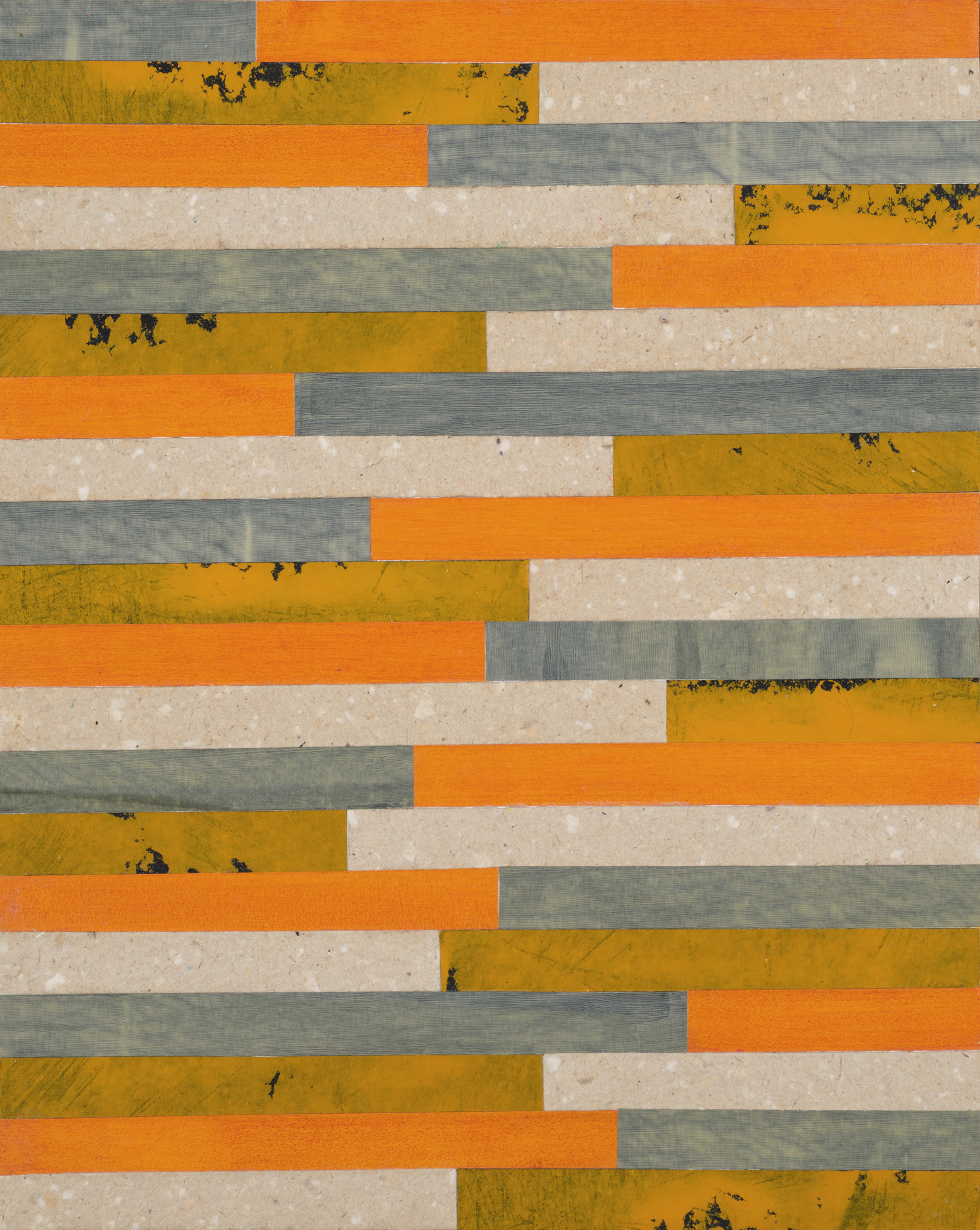 Abstract vintage, found and painted paper collage composed of dynamic linear bands of color and texture, influenced by urban architecture