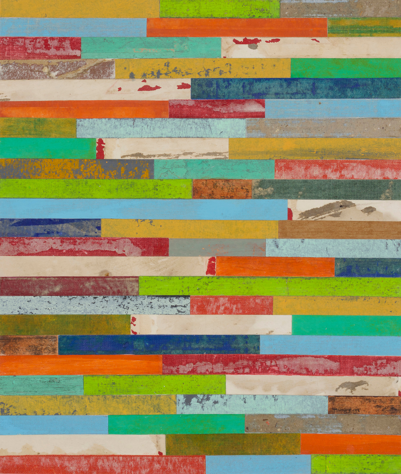 Linear abstract composition made of horizontal bands of colored and textured paper, referencing urban architecture with maple museum frame and archival rag mat
