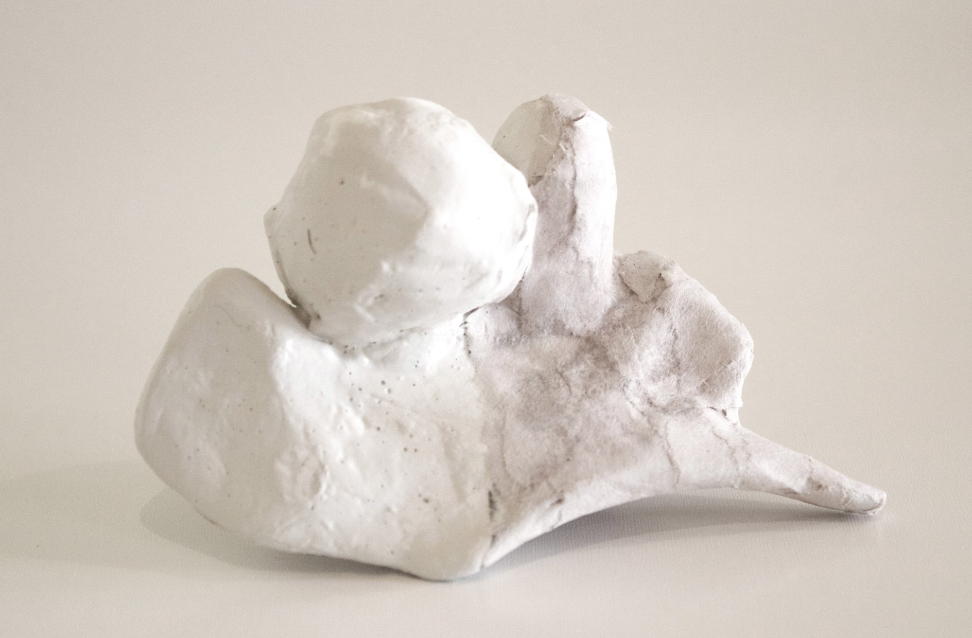 When I lived in London I had a mudlarking permit and I would walk along the Thames and collect bits of this and that. This piece is constructed of animal bone, a bit of a clay pipe, and paper. The piece is covered half in plaster and half in paper, its skin both hiding and revealing information.