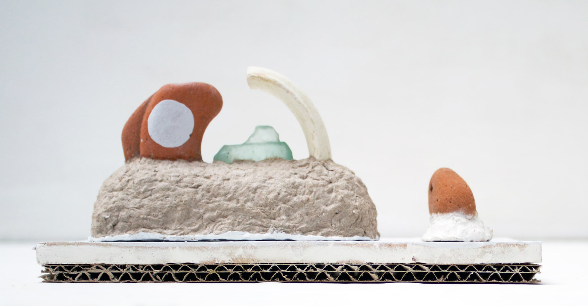 When I lived in London I had a mudlarking permit. I'd walk along the Thames and collect bits of pottery and brick and glass that I would then bring back and arrange. In this piece I was taken with the all that is left of a brick, a small bit of interior that I then sunk in reconstituted cardboard.