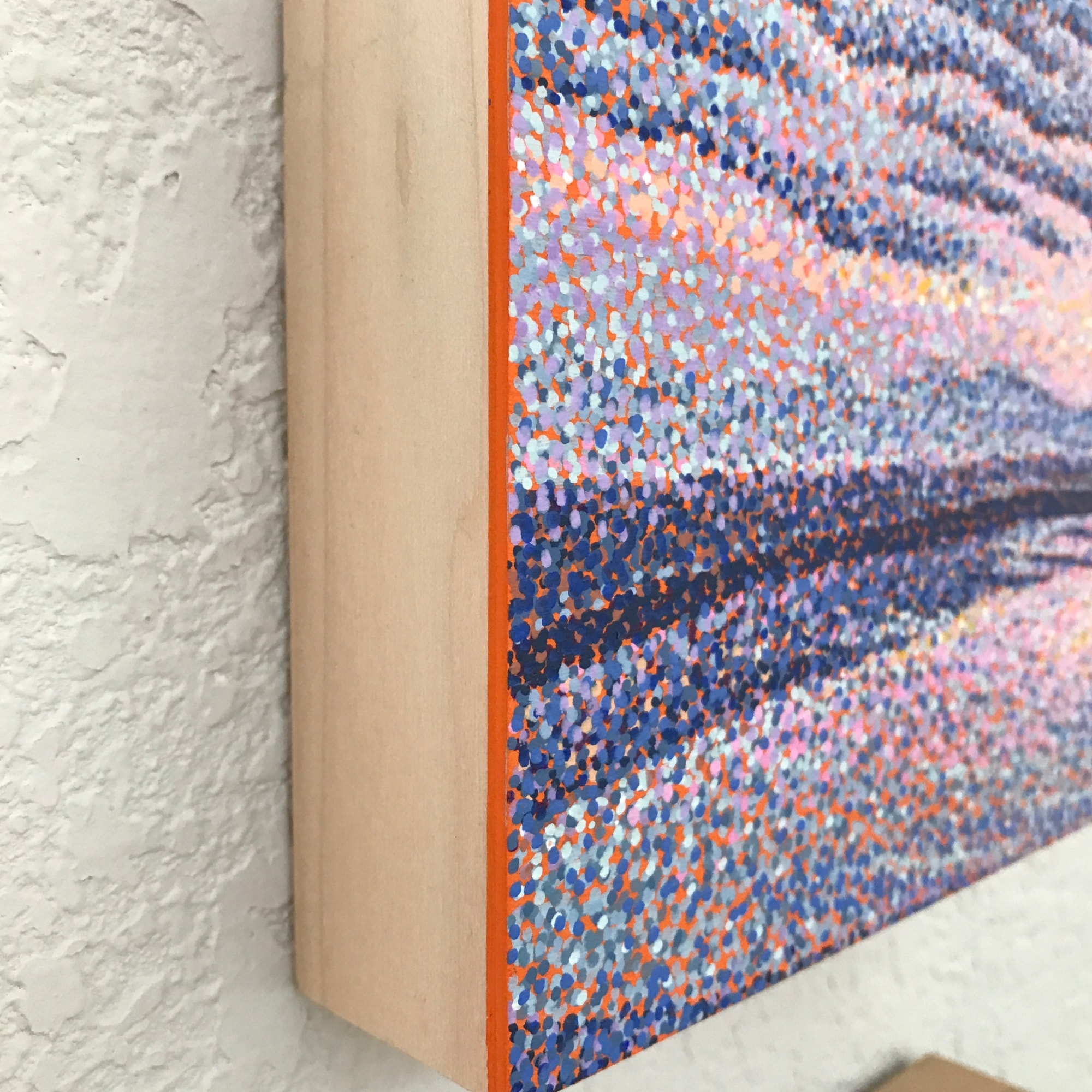 A small pointillism seascape done of a west coast sunset. There are lots of dots in orange, yellow, pink, purple and blue.