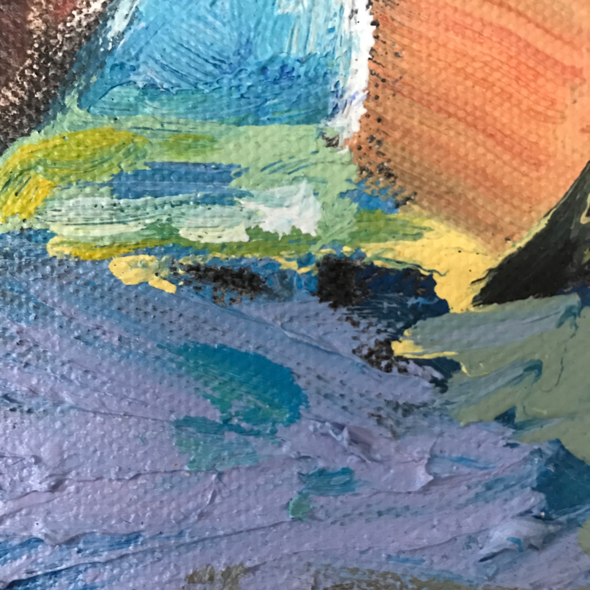 The piece is in a loose, impressionistic style using acrylic and charcoal, and a generous sense of color. The piece is currently framed.