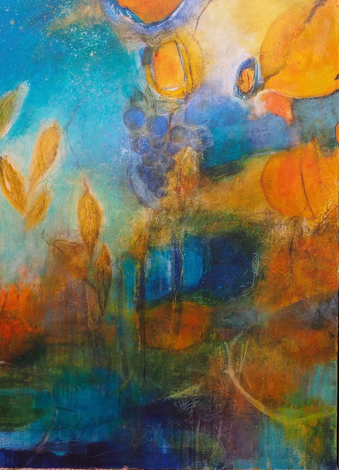 Abundance is painted in oil, cold wax, pastel, and charcoal on two cradled panels.
