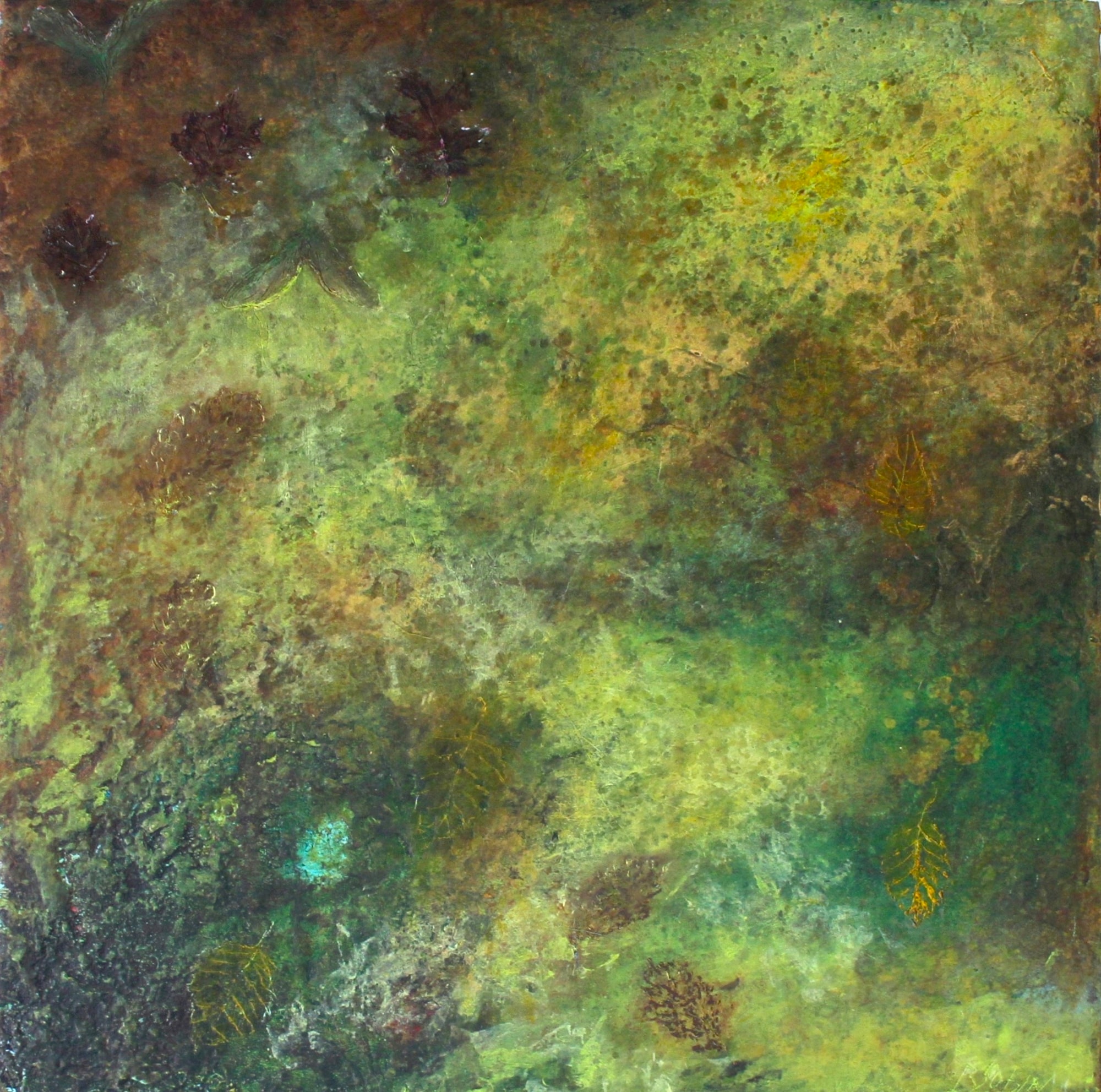 Oil, cold wax, and pastel with sgrafito on cradled panel. Forest Floor is in the series “Earth Dreams”.