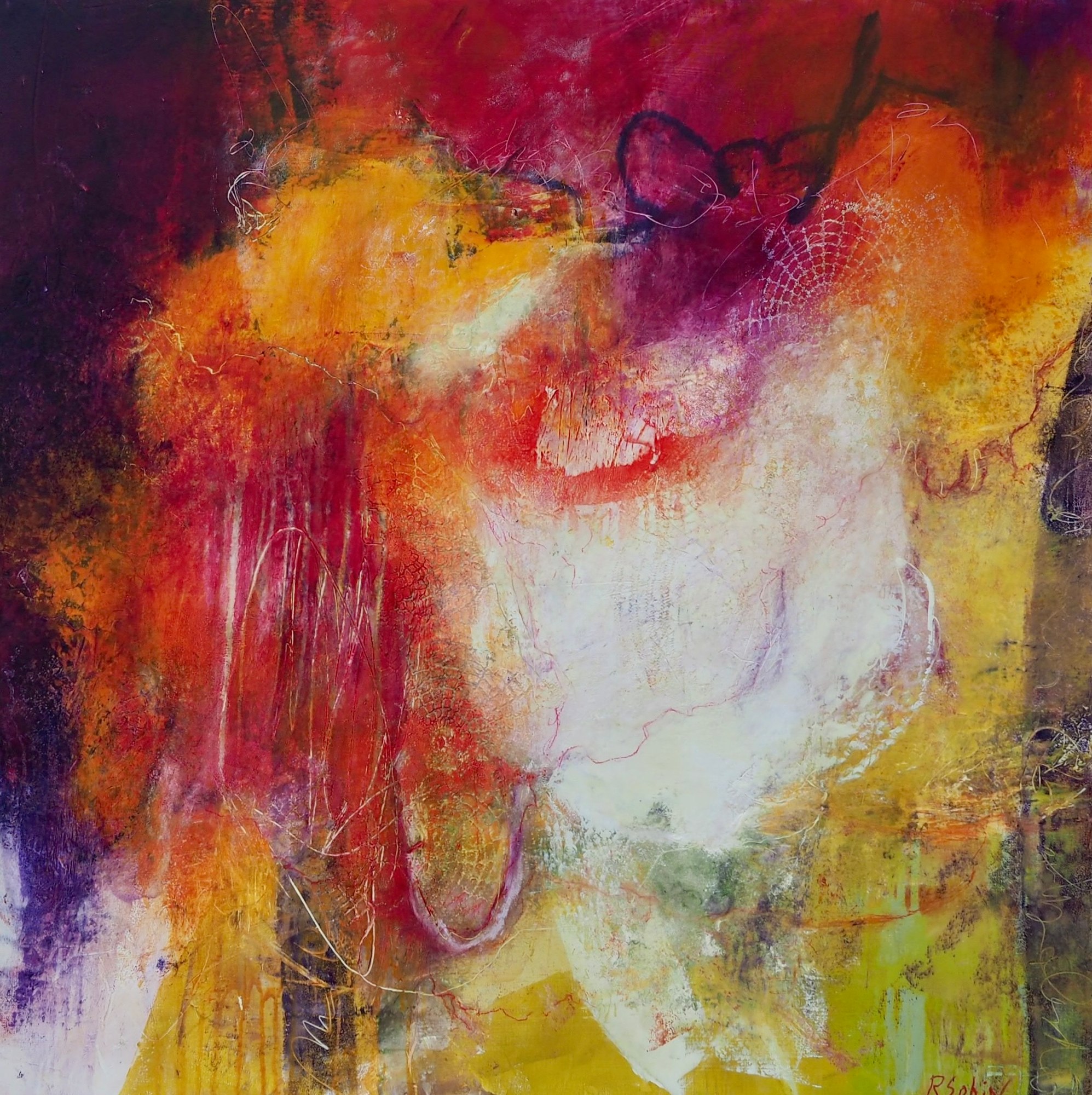 Oil, cold wax, and pastel on cradled panel. Intertwined is in the series "The Intimacy of Language".