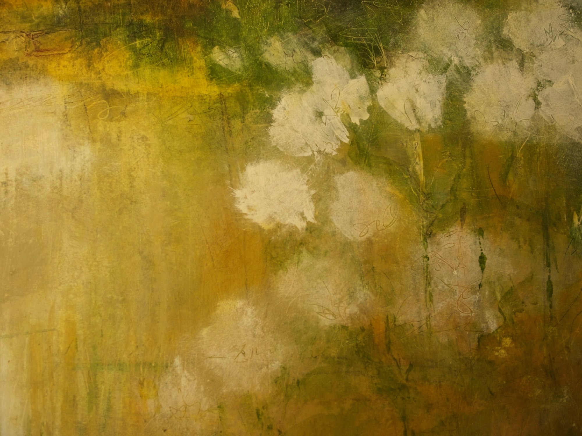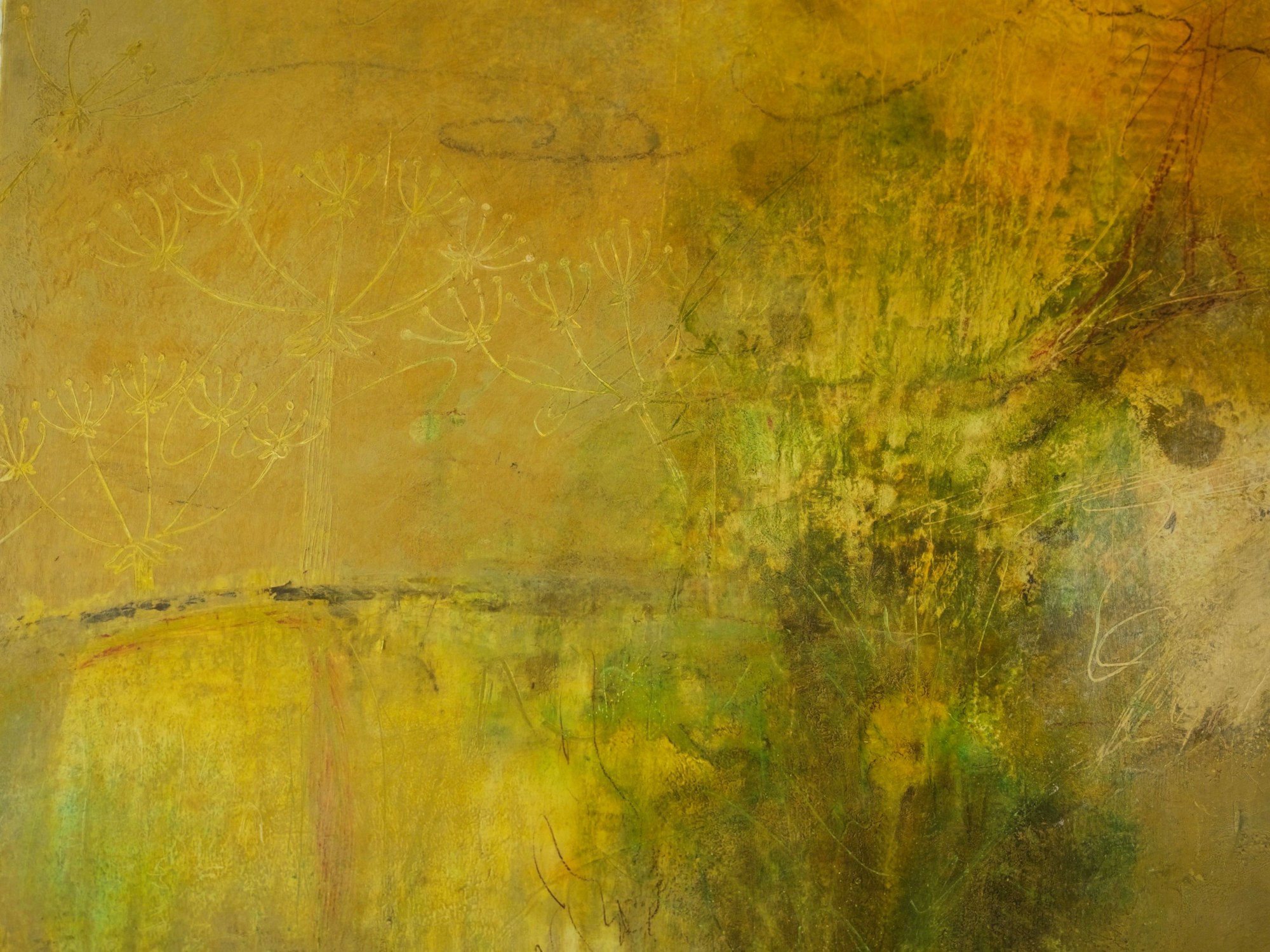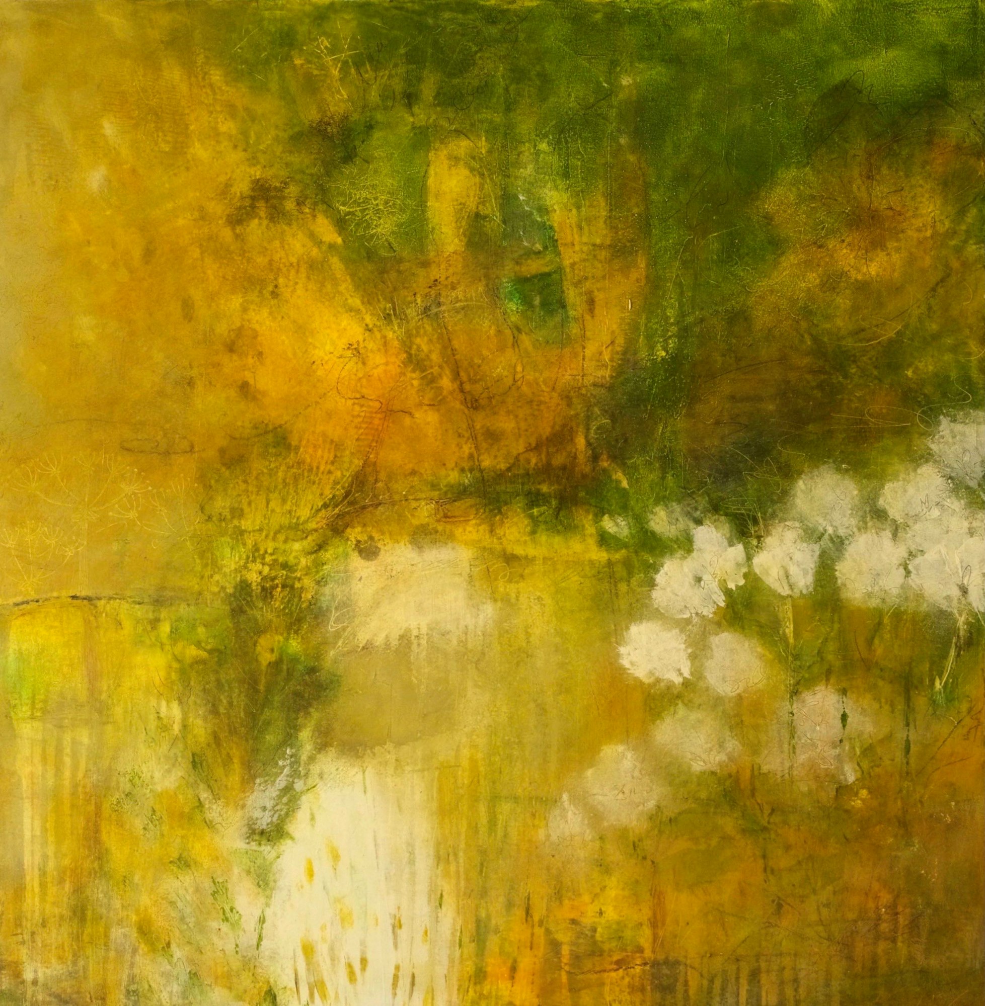 Oil, cold wax, and graphite with sgraffito work on cradled wood panel.