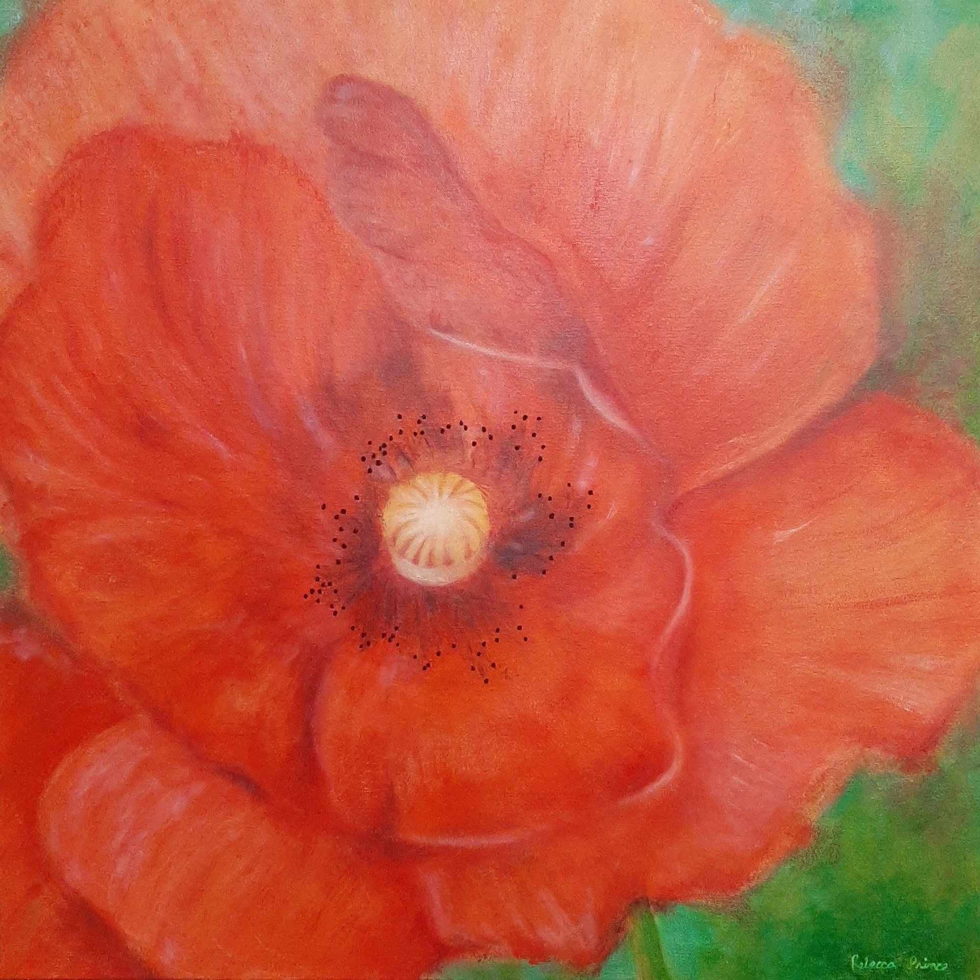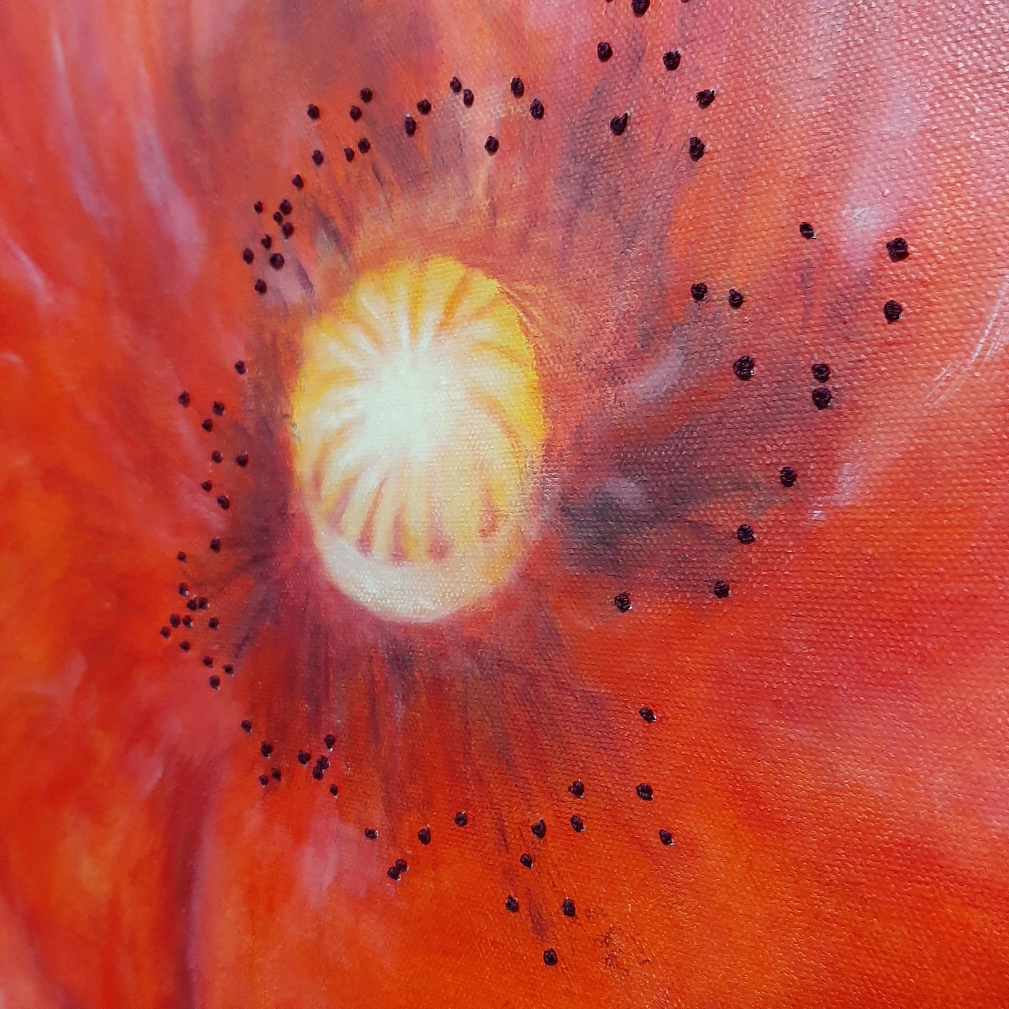 In "Remembrance", a single poppy blooms in luminous reds and oranges, its petals unfolding with quiet power. The center is delicately hand-embroidered, each black stamen stitched into the canvas as an intentional gesture that blurs the boundary between painting and textile, image and object.
