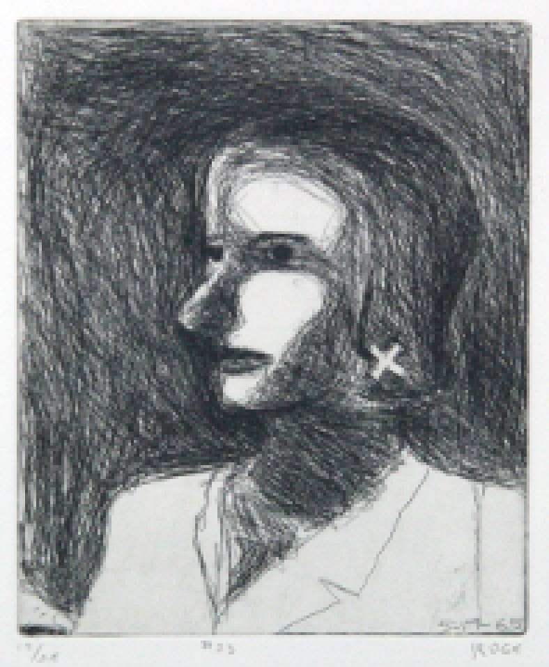 Bust-length portrait of the artist's wife, Phyllis, in three-quarter view against a dark background with X-shape in her hair.