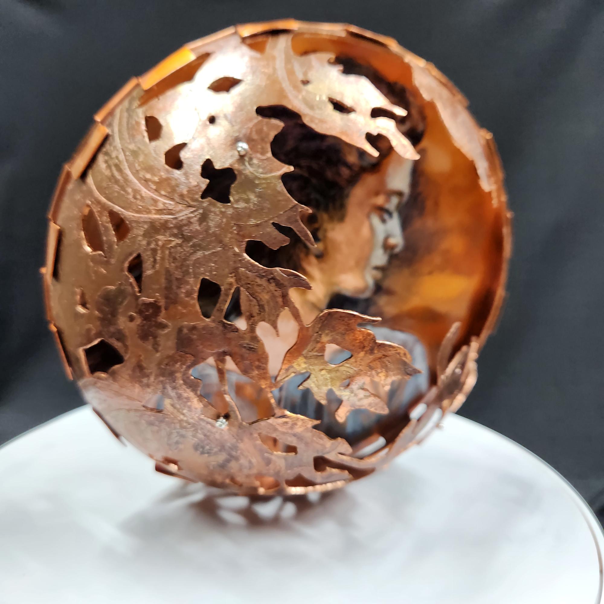 This hand pierced round cold connected bead features 2 figures painted on either side of the inner piece of copper. Both figures, one male and 1 female are depicted in a dream state. The electronic rotational display base is included with the artwork. Outside beads feature salt water etched textures recalling bedroom textiles. Silver ball rivets are attached as embellishments.