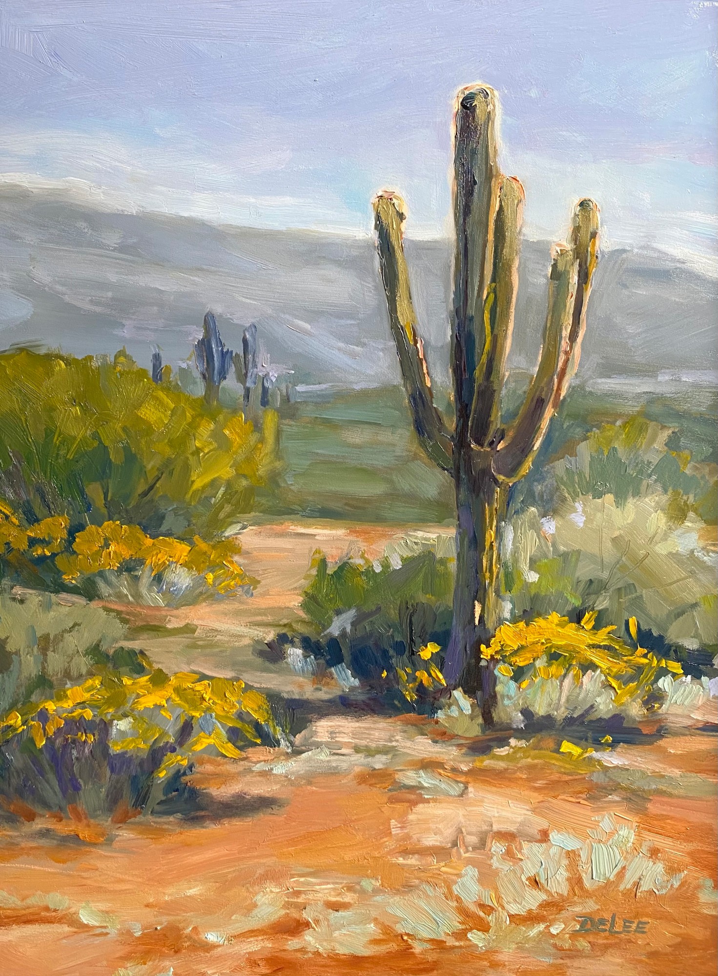 Escaping our cold winters in Canada, it is often a great break to head south with the snowbirds. This piece was painting "en plein air" in the hot Arizona desert in March. The recent moisture received in the desert made for some beautiful desert blooms.