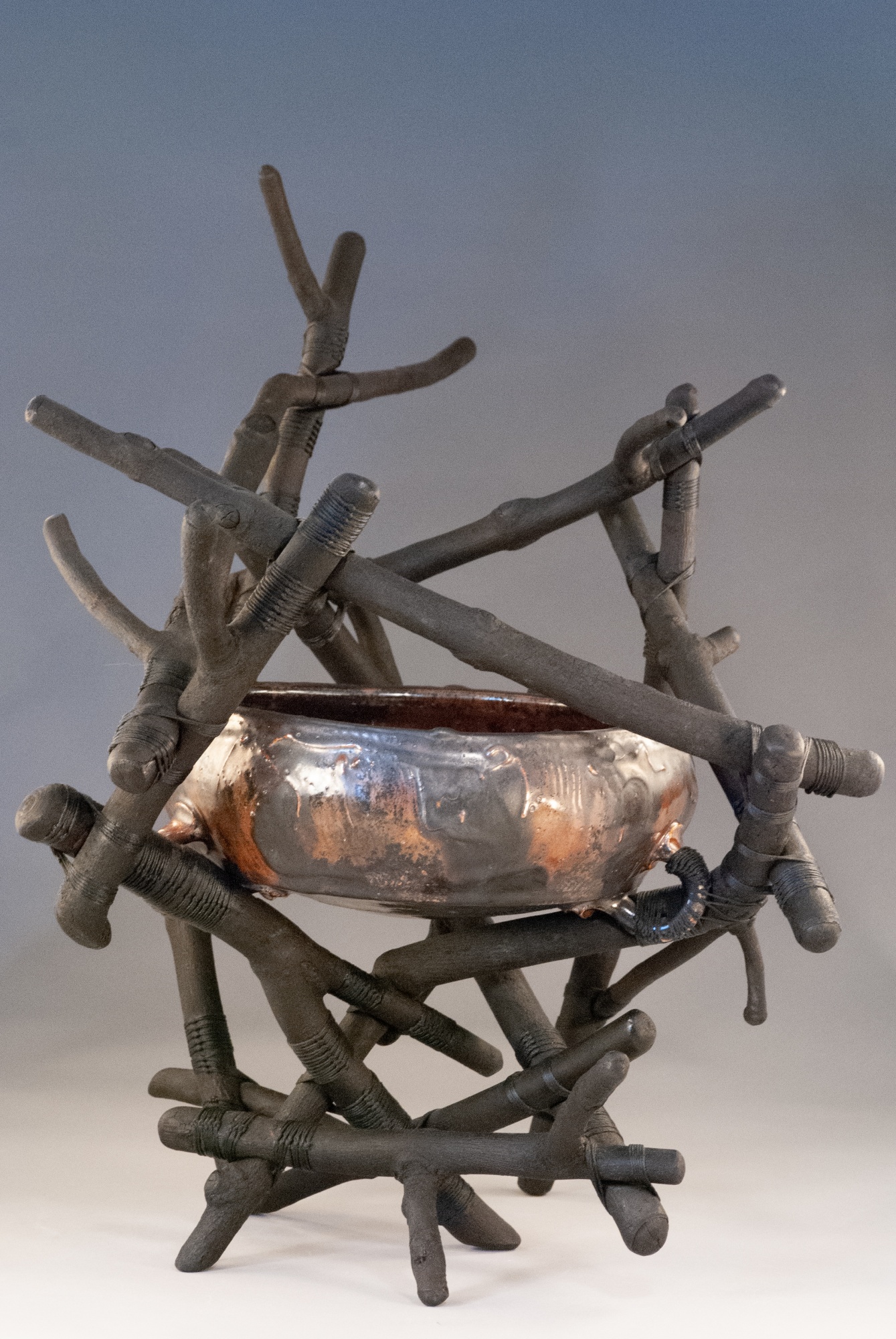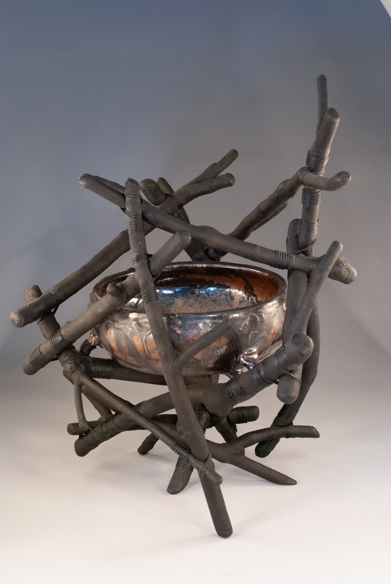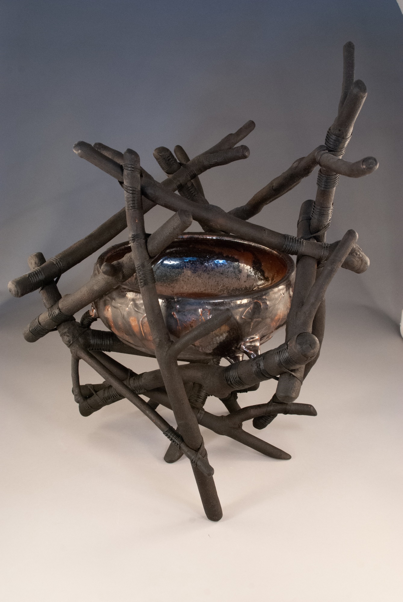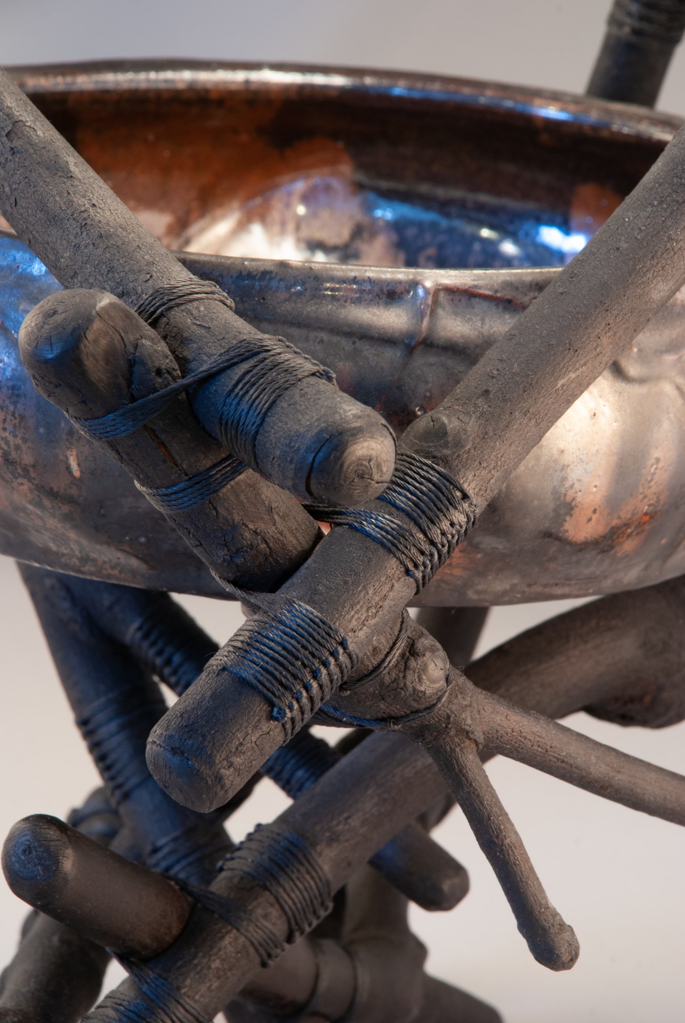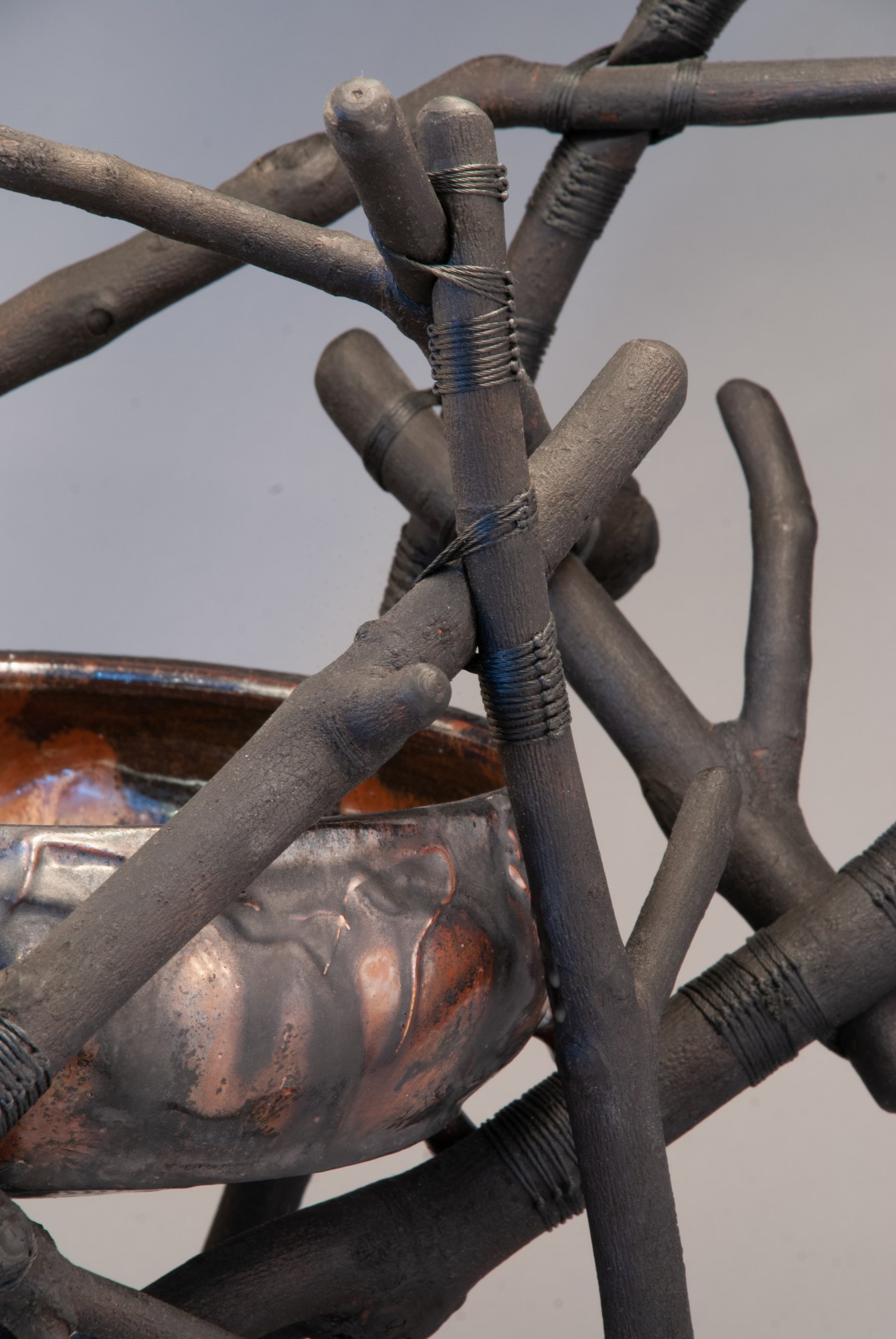 Ceramic bowl with burned ash branch stand. Knotted thread fastening. Exploring colonialism and the land around us.