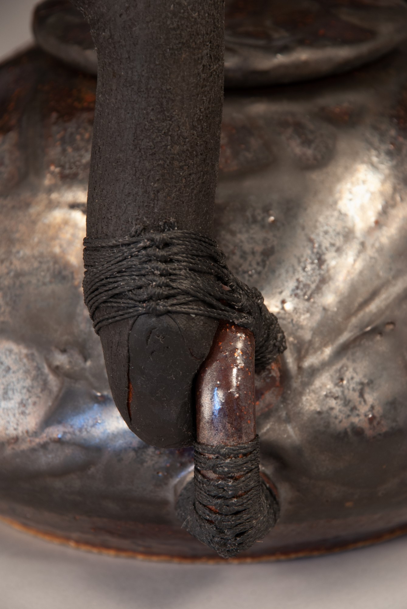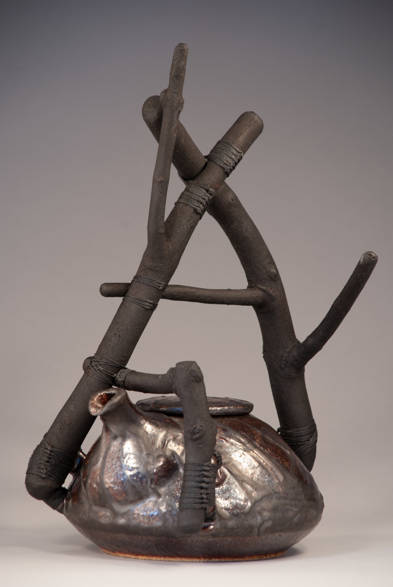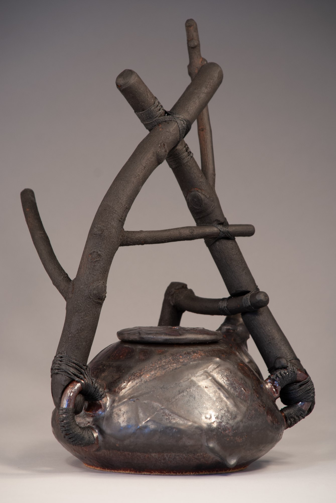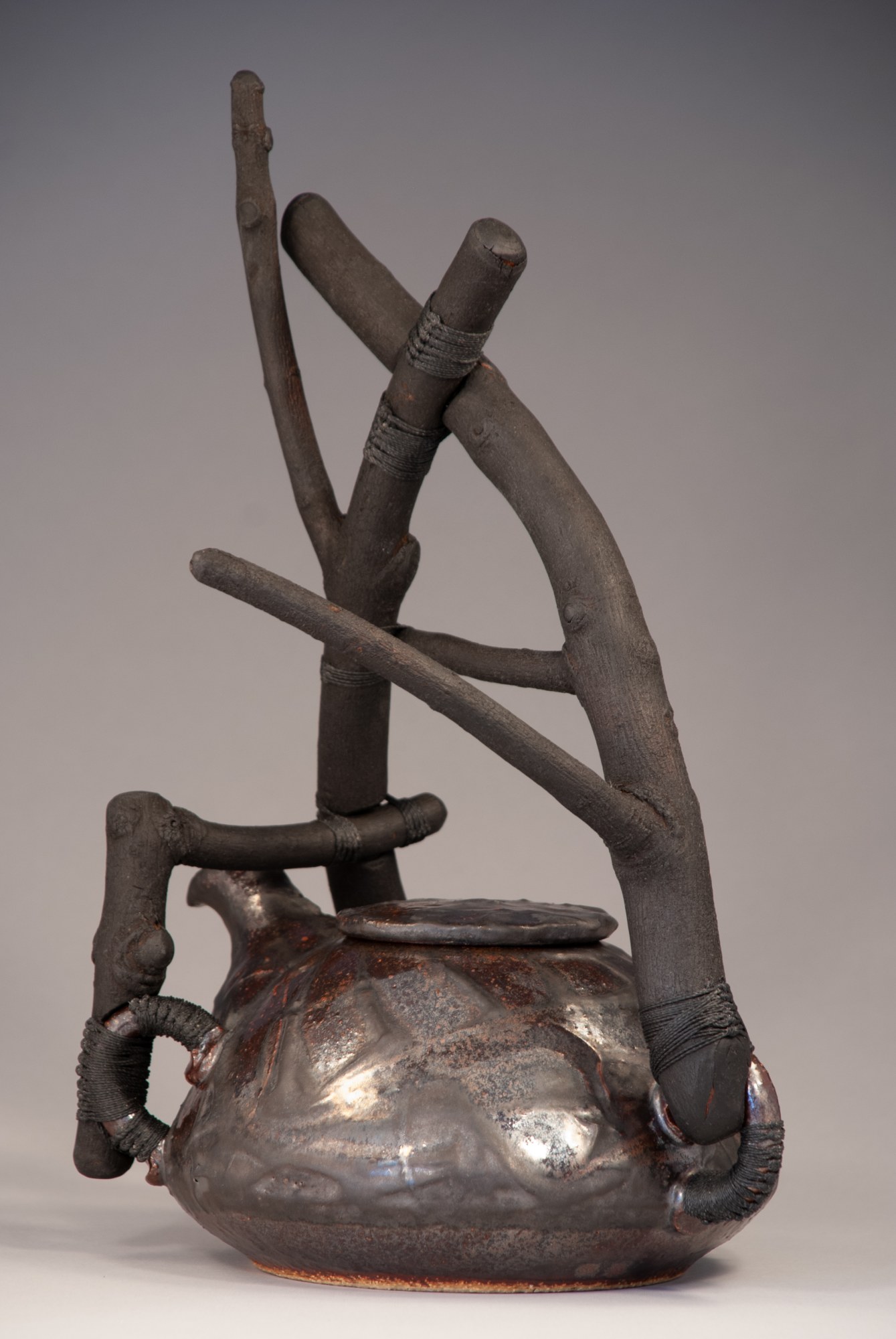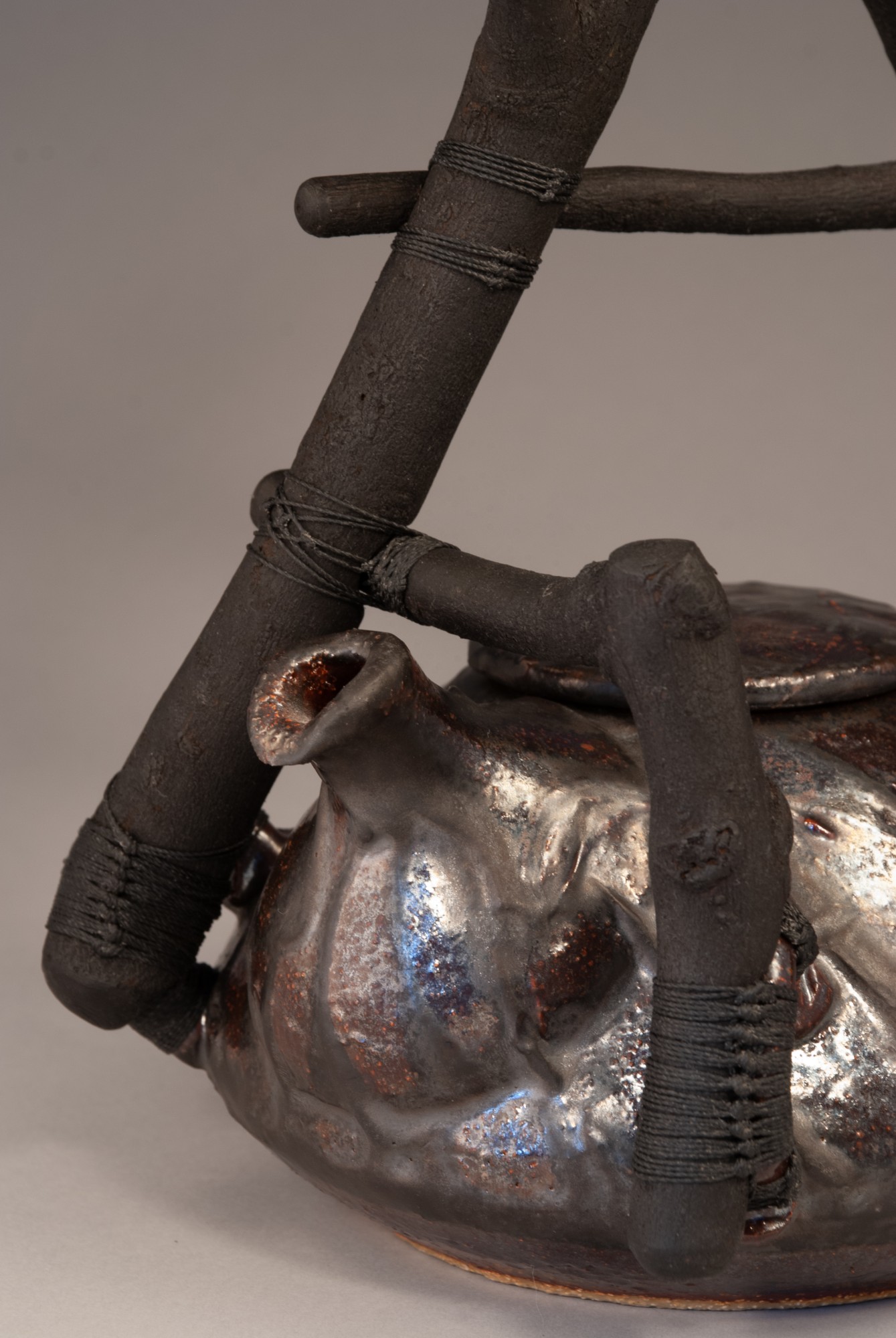 Ceramic teapot with burned ash handle. Knotted thread fastening. Exploring colonialism and the land around us.