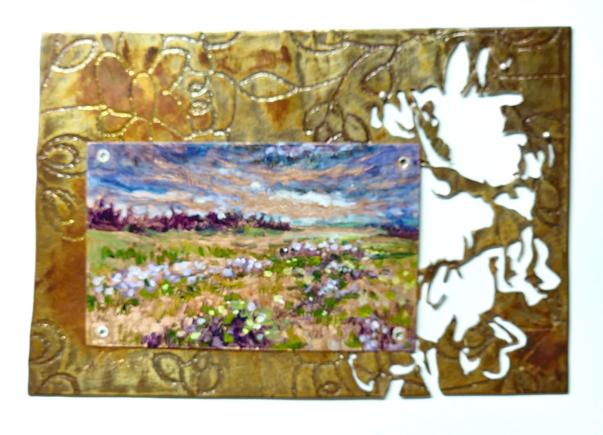 24 gauge copper texturized through a rolling press. Liver of Sulpher patina. Hand pierced with a coping saw sanded and embellished with handmade silver ball rivets. Acrylic painting on 24 gauge copper is mounted on the 1st copper backing with tube rivets. The piece is varnished on the front and back to prevent oxidization and is securely mounted on malomine coated board and framed in a German Silver metal frame.