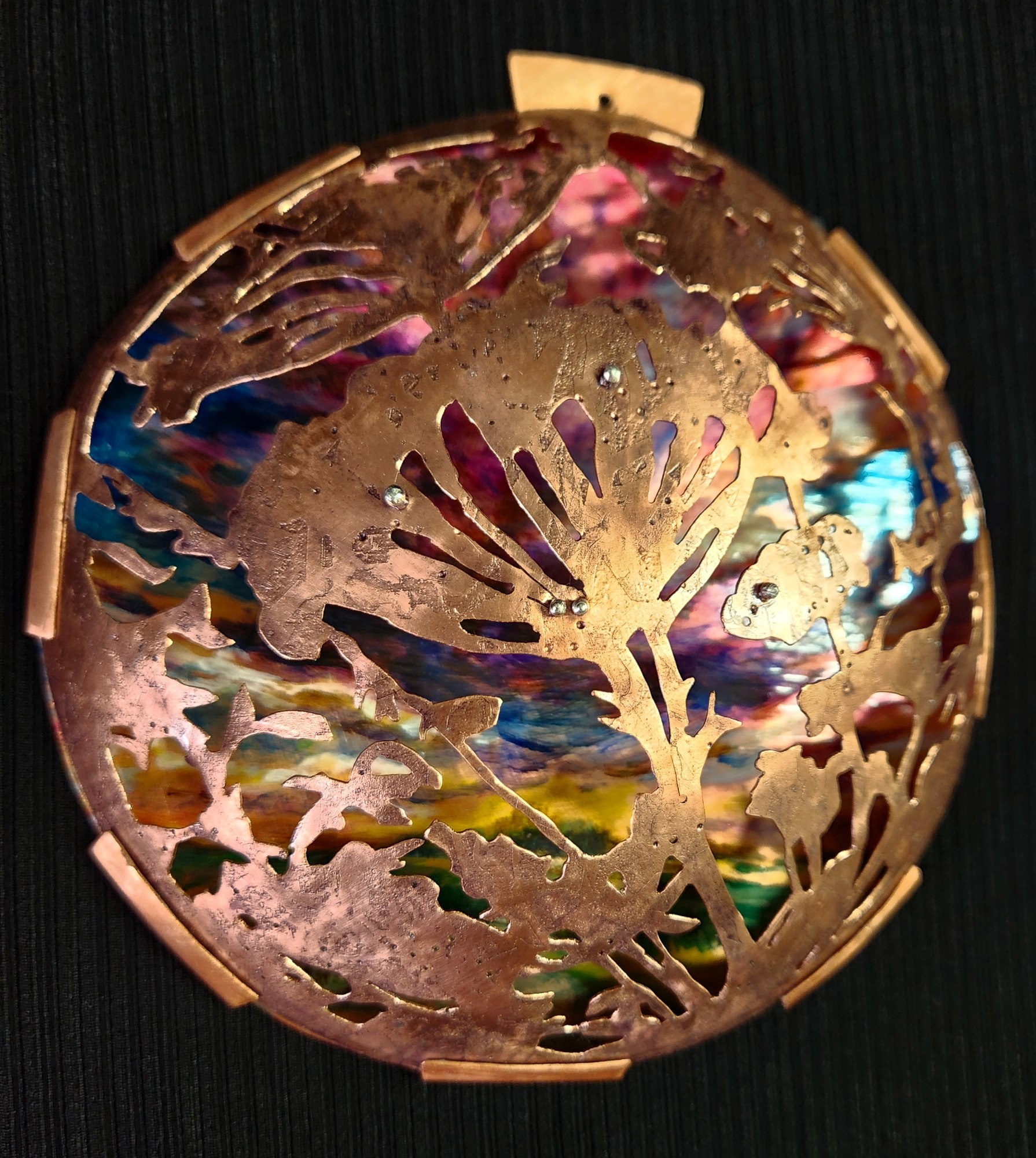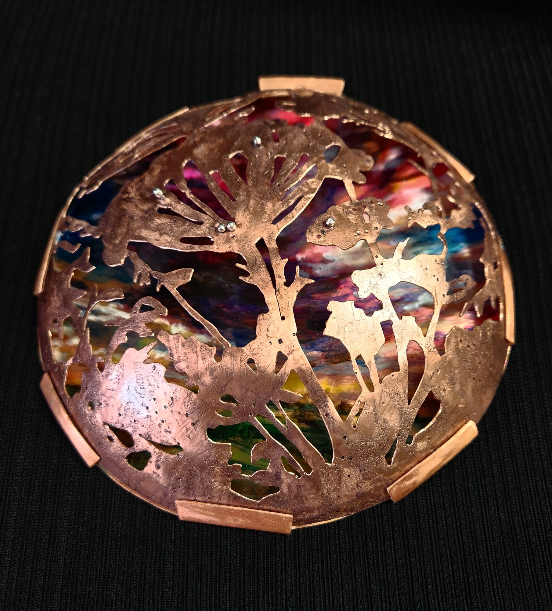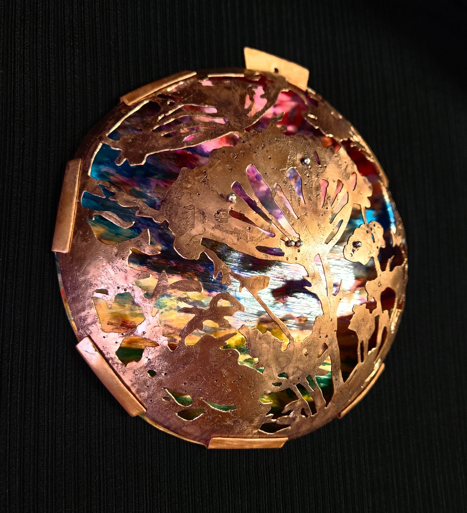Hand domed and hand pierced with a coping saw. Salt water etched with water reflections. A water parsnip image is pierced out on the dome and hand created silver rivets were added as embellishments. The 1/2 dome is cold connected to the copper base with tabs. A scene of a prairie sunset is painted on the back plate and can be viewed through the domed piece. To dome the top piece of metal required commissioning a large scale wooden dapping set to be commissioned by Sask. wood working Dale Lowe. The top copper piece required annealing a dapping 10 seperate times to get it to domed.