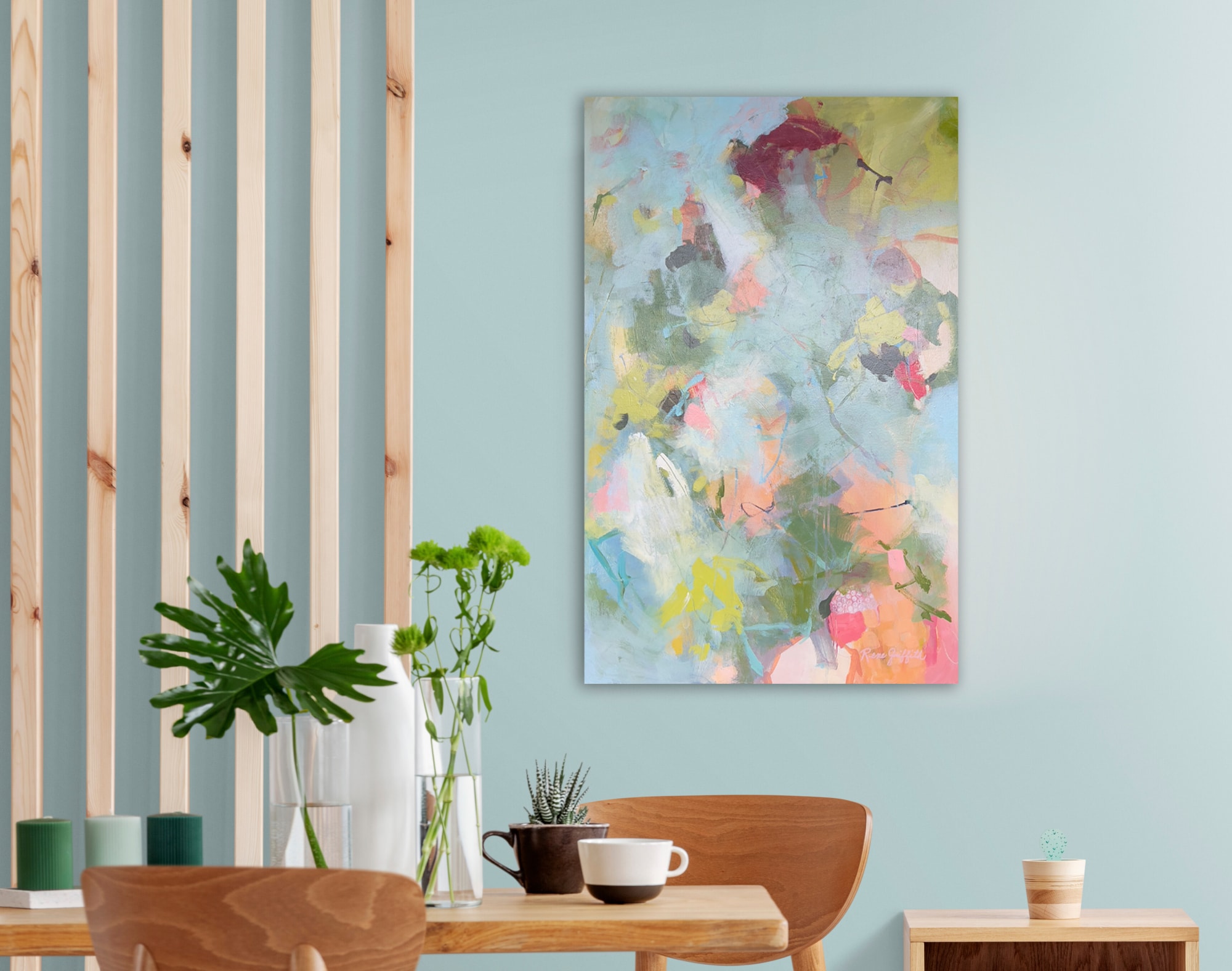 De-Vine offers a luminous exploration of color and form, where gentle pastels blend seamlessly to evoke the delicate beauty of a garden in bloom. The interplay of translucent layers and textured brushwork creates a sense of depth and movement, inviting the viewer to experience a tranquil, uplifting ambiance. Through fluid organic shapes and a balanced composition, the artwork captures a harmonious dialogue between lightness and vitality, celebrating nature’s quiet elegance with refined subtlety and grace.