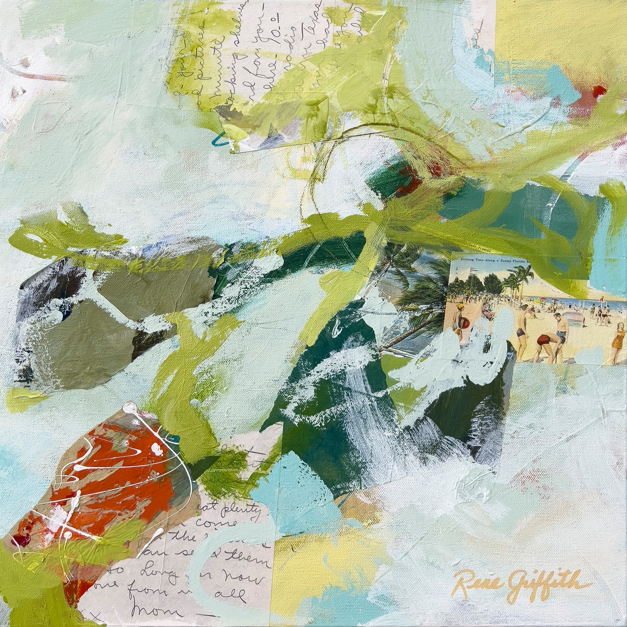 Found Letters II explores memory through layers of paint and vintage collage elements—old letters, book pages, and a postcard. Working with light blues, olive greens, and soft yellows, I aimed to create a composition that balances vibrant energy with quiet reflection. This interplay invites viewers to look deeper and consider their own pasts. This piece feels like a visual conversation between spontaneity and intention, capturing the way memories fade and resurface over time.