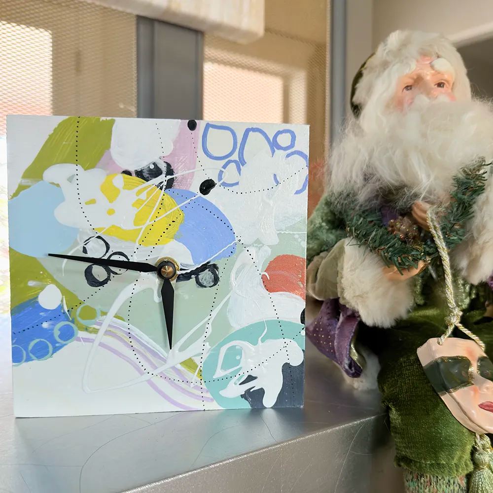 6"x6"x1.5" hand-painted battery-operated clock on wood cradle. Colorful, whimsical, and fun clocks can go in any decor and room in your home--on mantle, book shelf, table, nightstand, or hang on your wall. Make great gifts for your fun-loving friends and family members.