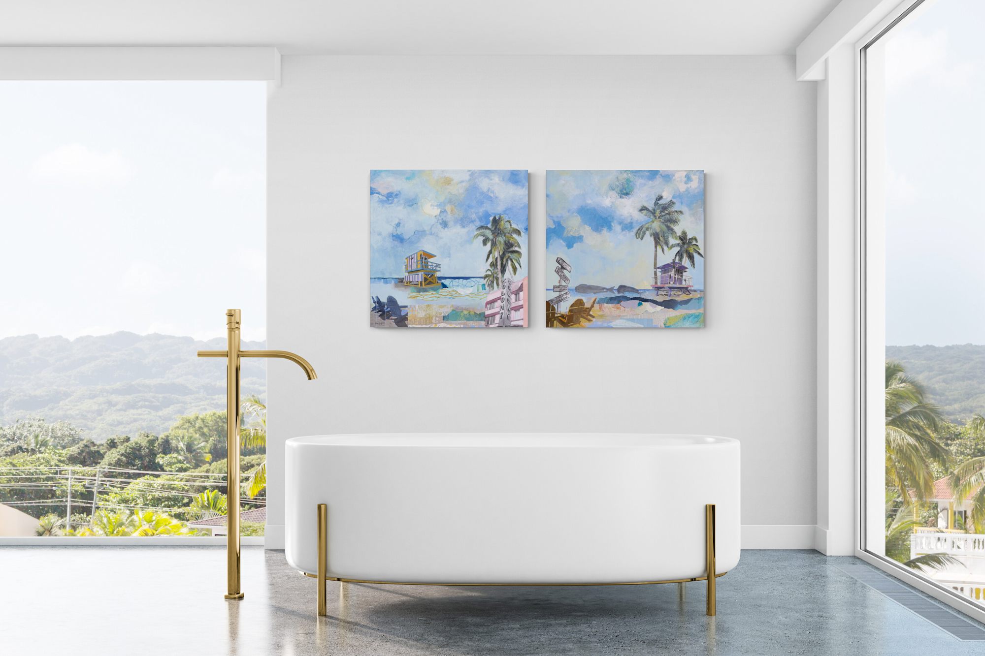 Living in Paradise is my joyful take on the vibrant energy of Miami Beach. I combined collage, photography, and paint to bring to life a lively coastal scene filled with colorful beach chairs, whimsical dolphins, and those iconic lifeguard towers I love. The bright, sunny vibe and playful mix of realistic and dreamy elements capture the spirit of South Florida in a way that feels both familiar and a little unexpected. Working on this 30-inch square piece was a fun dive into the colors and textures that make paradise feel like home.