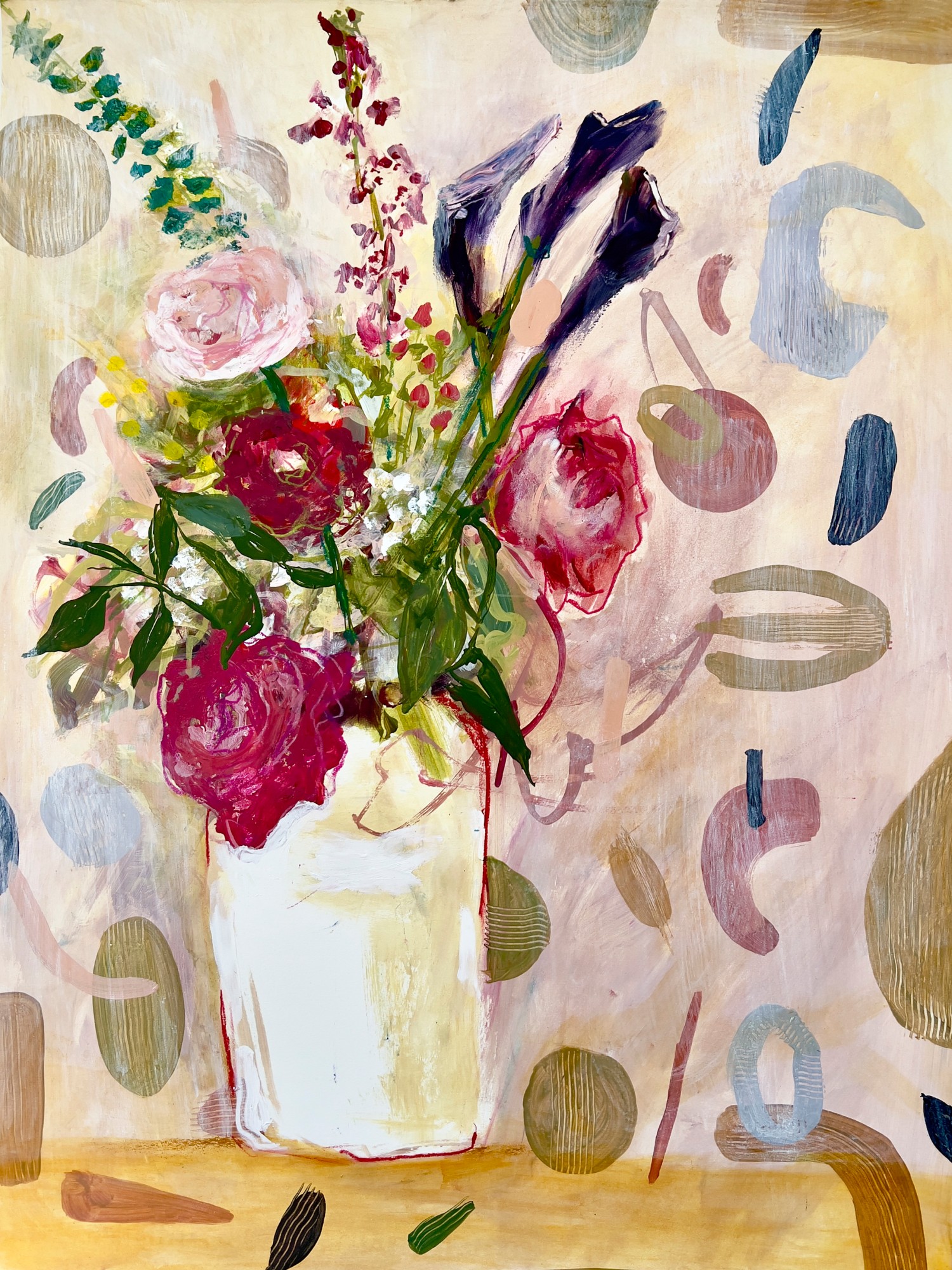 My piece, You Don’t Bring Me Flowers, began with a simple still life of fresh blooms arranged in a white vase against a mid-century modern fabric backdrop. I wanted to create a dreamlike quality by blending realistic floral detail with abstract, muted shapes and colors in the background. The contrast between the lush reds, pinks, and purples of the flowers and the soft pastel tones around them reflects my exploration of memory and imagination—how everyday moments can feel both vivid and surreal. This work is a meditation on beauty and the unexpected ways it can appear.