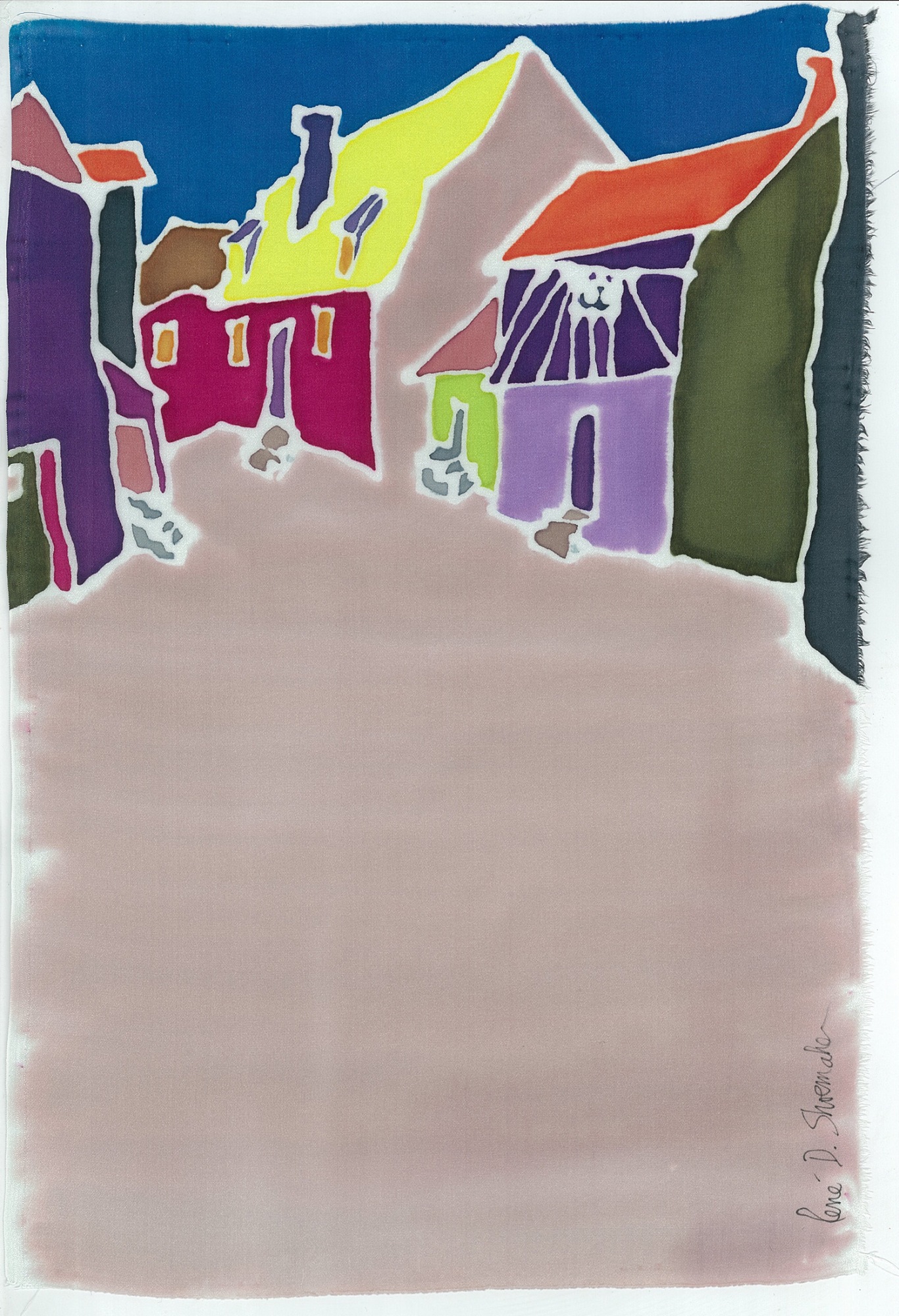 A sense of quiet and peace is created by the taupe color field street at the bottom of this painting, leading the viewer's eye into the colorful collection of houses, ending with the deep blue sky at the top of the silk.