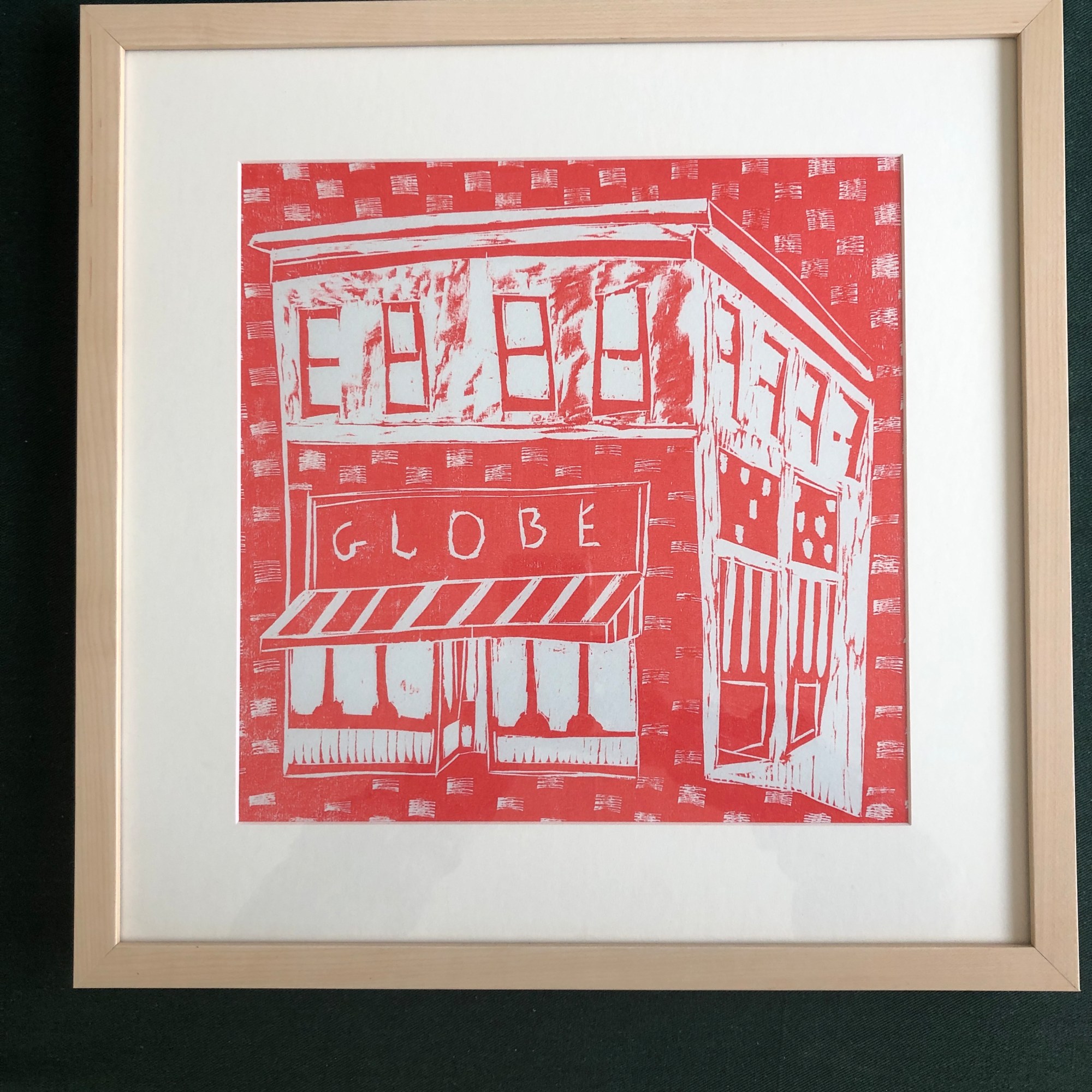 Meeting friends is one of the best ways to stay healthy in mind and body. The Globe in Athens, GA is a friendly pub well-loved by university students, professionals and townies alike. This original wood block print was made to celebrate the joy of this local small business and sturdy architecture found in downtown Athens!