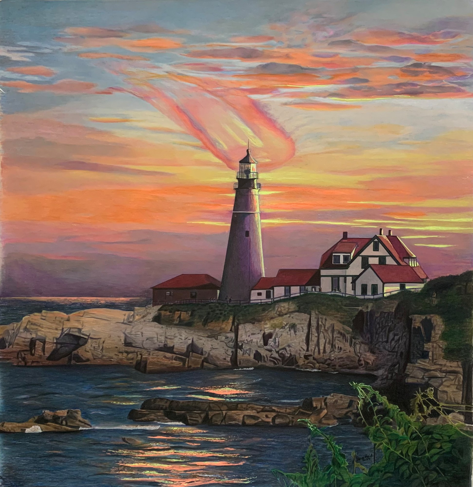 This creation draws inspiration from a visit to Portland, Maine, where the captivating Portland Headlight Lighthouse in Cape Elizabeth stole the spotlight. It was a beautiful blue sky day during our visit. However, as I sat down to create this piece, I kept being pulled towards a more dynamic scene. I resisted and resisted, and when I finally gave in, it ultimately gave birth to the piece you see today.