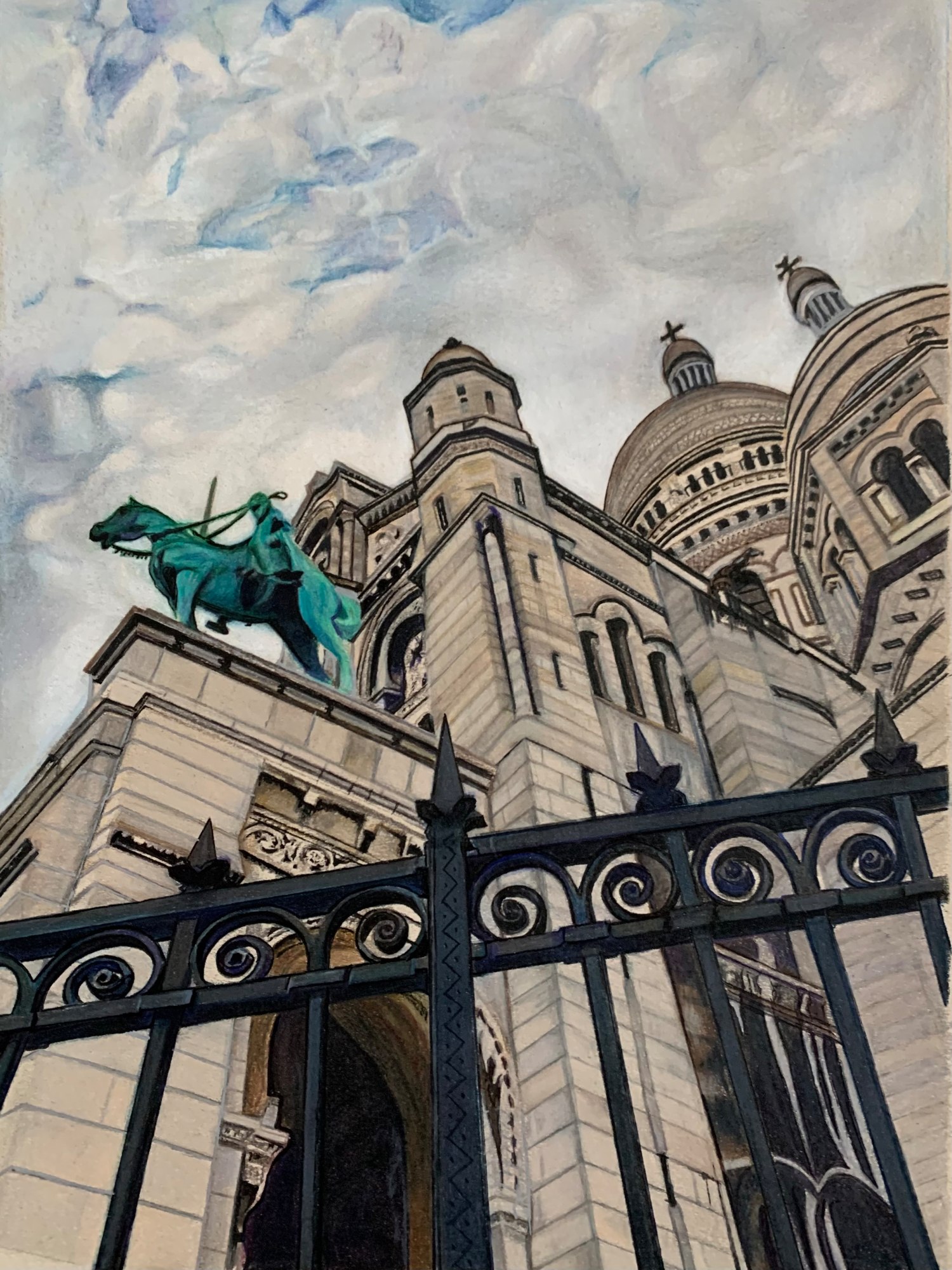 We All Do It Sometimes (Get on Our High Horse) was inspired by a visit to the Basilica of Sacré-Cœur in Paris. I had been sitting on the steps enjoying the city view when I turned around and saw this striking angle, where the building and the horseman seemed to come alive. As I later worked slowly through each detail, the humorous title came to me as a playful way to pique the viewer’s curiosity.