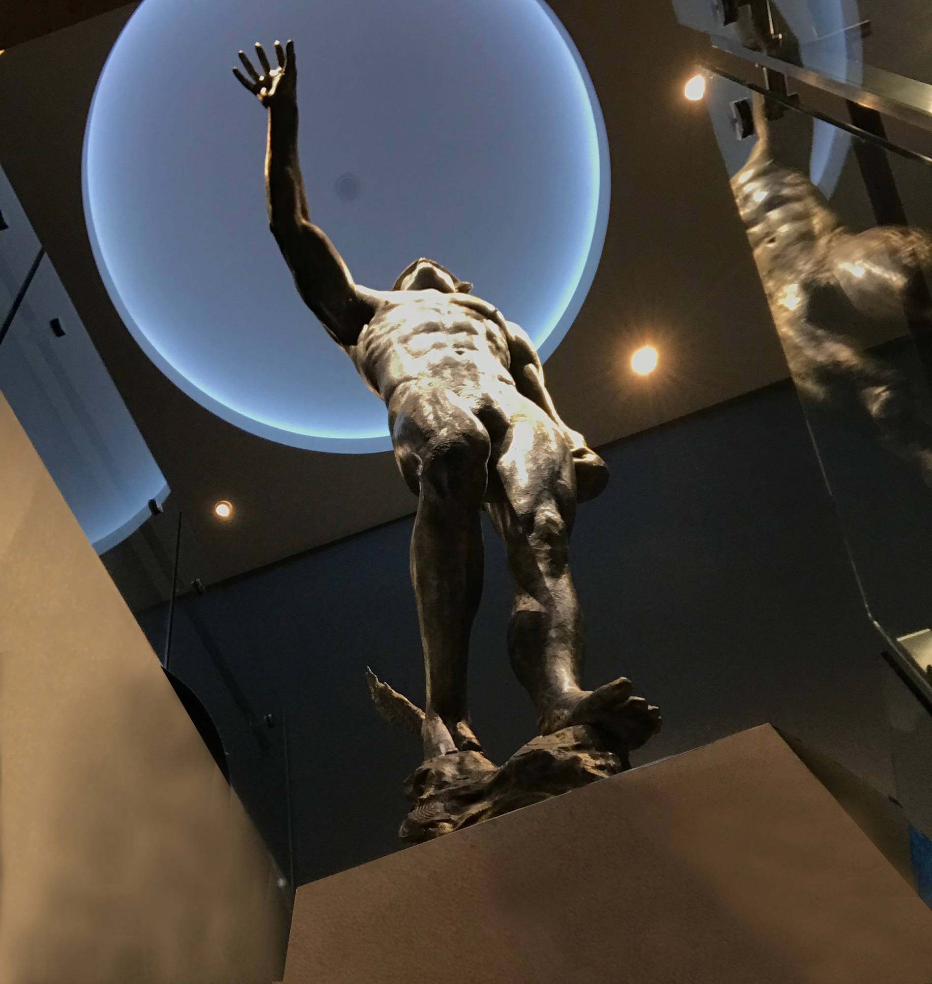 The sculpture was cast in stainless steel, a deliberate decision to create a bright, contemporary feel to one of the most celebrated gods in sculptural history.