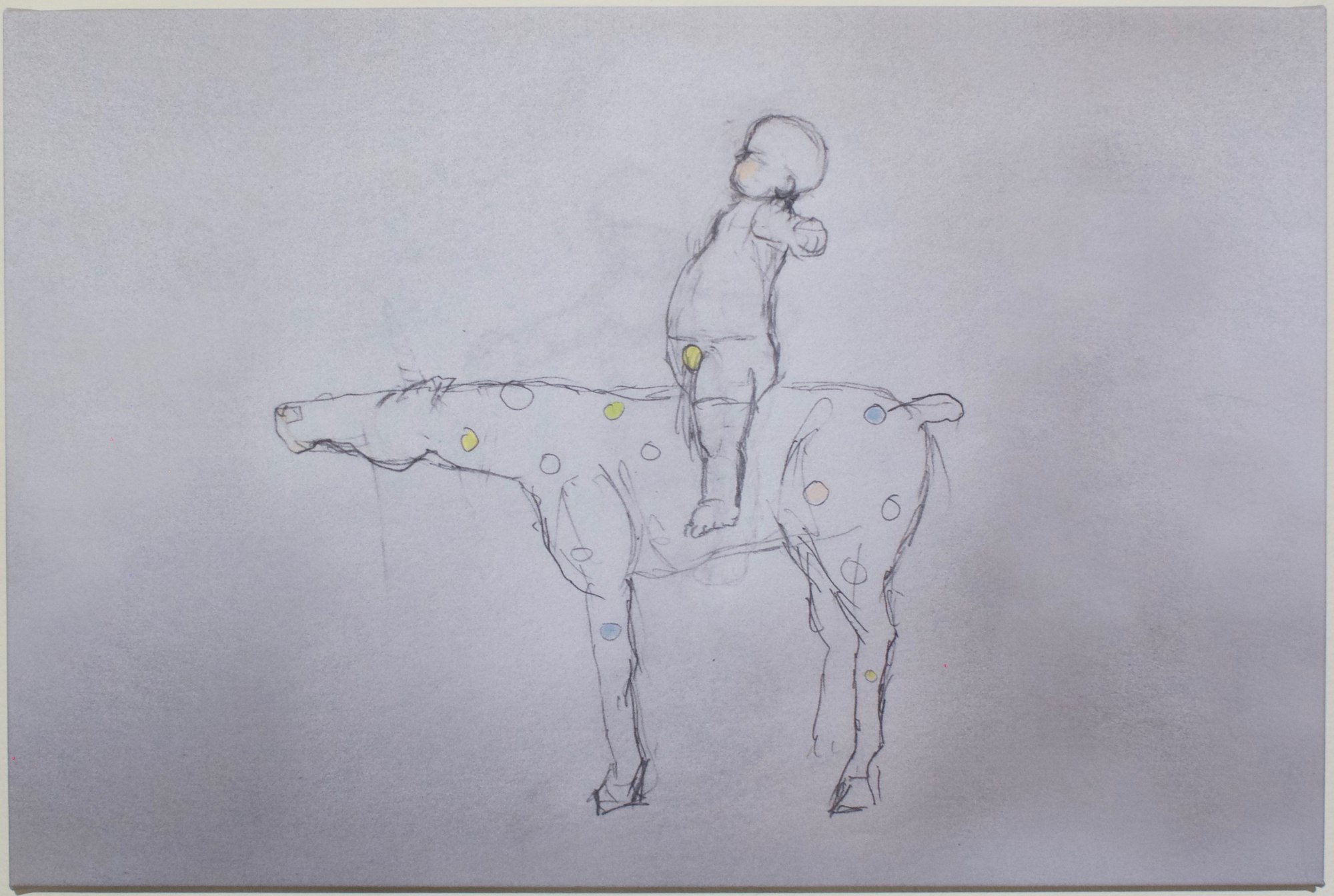 Mixed media artwork private commission. Tot on Horse with Spots is based on a lost drawing iPhone image. Printed by The University of the West of England and painted with oils, the canvas is from a special run of inkjet linen created by Becker's Hewlett Packard R&D team specifically for the "father of pop art" Richard Hamilton's final works.
