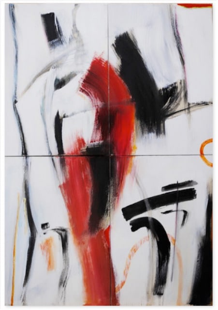 A painting in four parts. Panels work as individual paintings or can be rearranged to make new configurations, i.e. diptychs, triptych, or horizontal arrange of four.