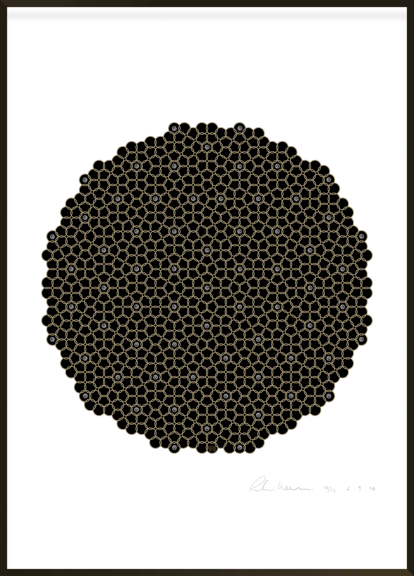 This design at first appears much more peaceful and symmetrical than the first two in the series. But something odd happens inside the pattern. Shooting diagonals, verticals and horizontals appear, and they are not symmetrical. These shooting stars create constellations in the universe of rings.