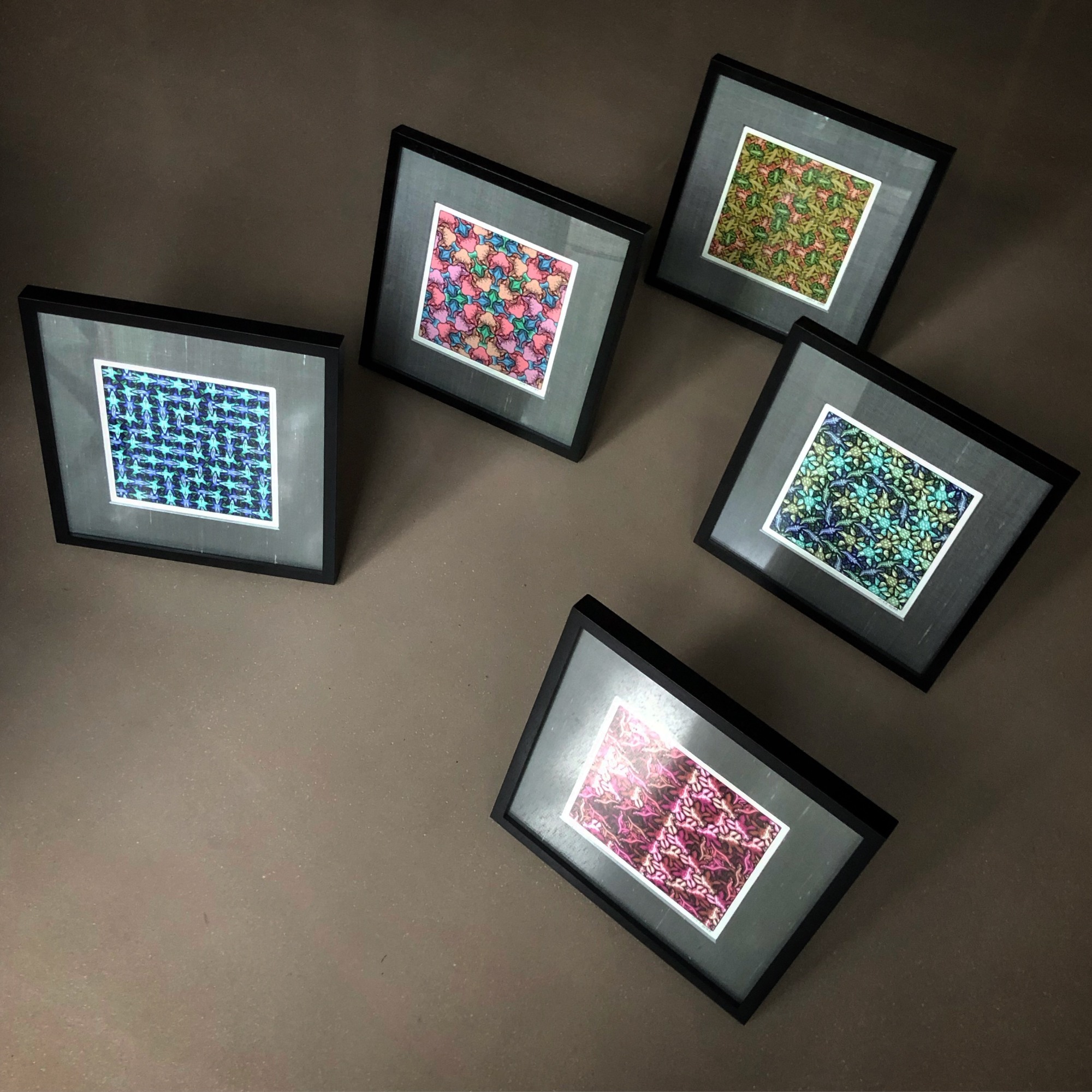 The five vignette prints that make up the collection are: Komodo Flow based on a space filling curve square tiling, Sierpinski’s Amphibia based on Taylor’s aperiodic Einstein tiling, Aperiodic Amphibia, based on the Ammann A3 Tiling, Crab Canon based on an aperiodic 5-fold Socolar tiling, and Migration based on my own discovery of a beautiful space-filling hexagonal tiling.
