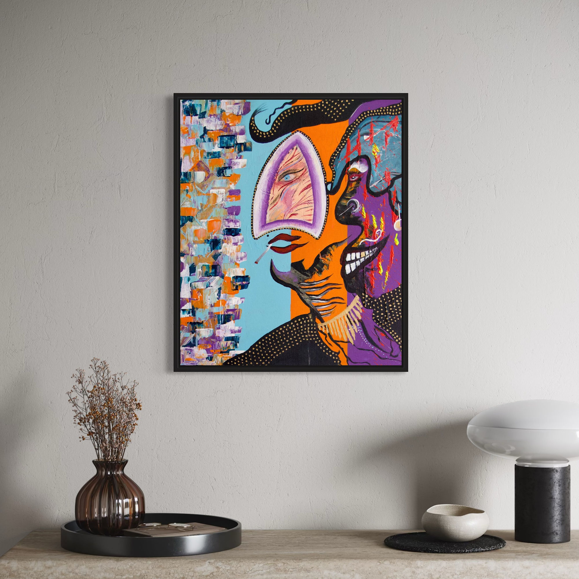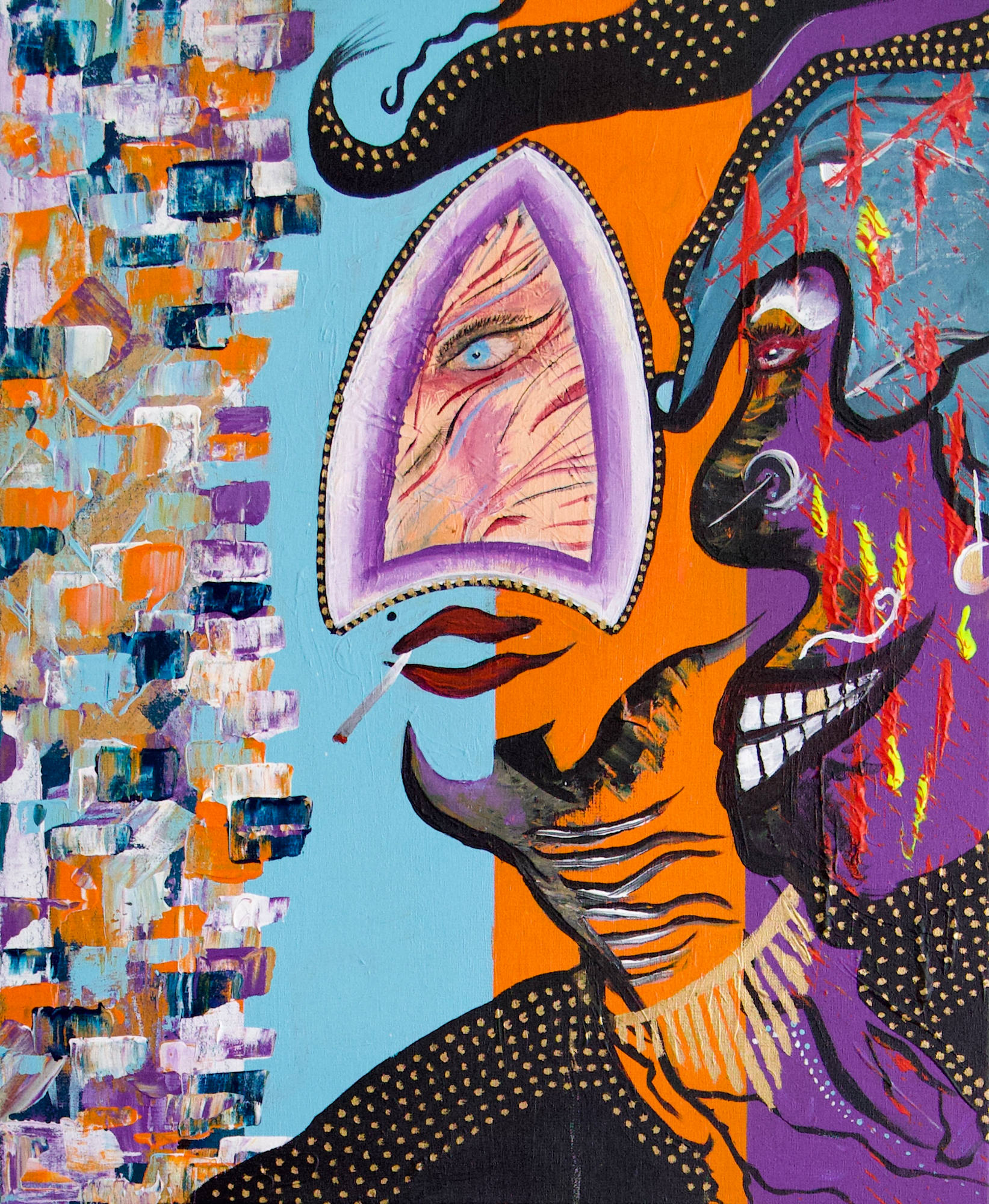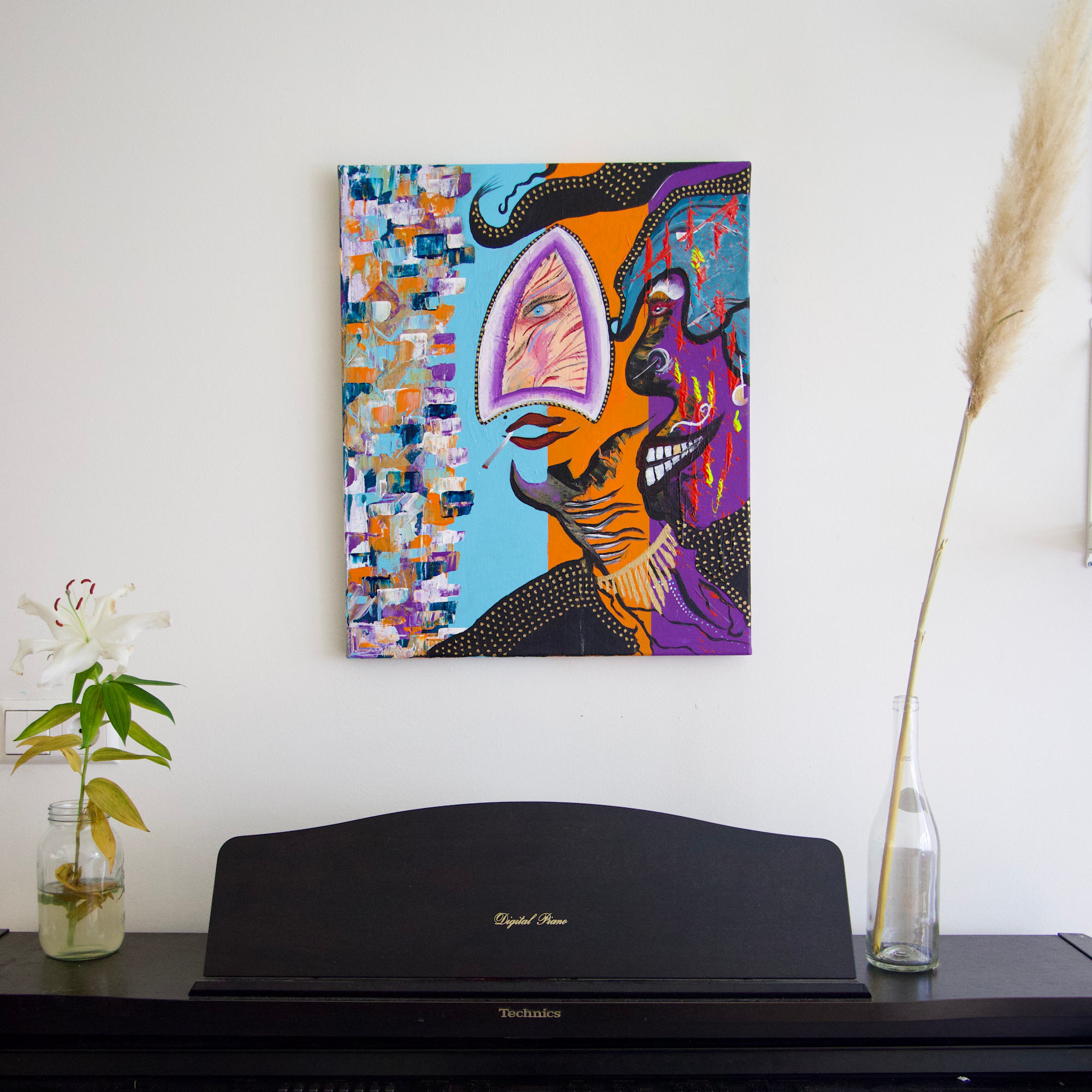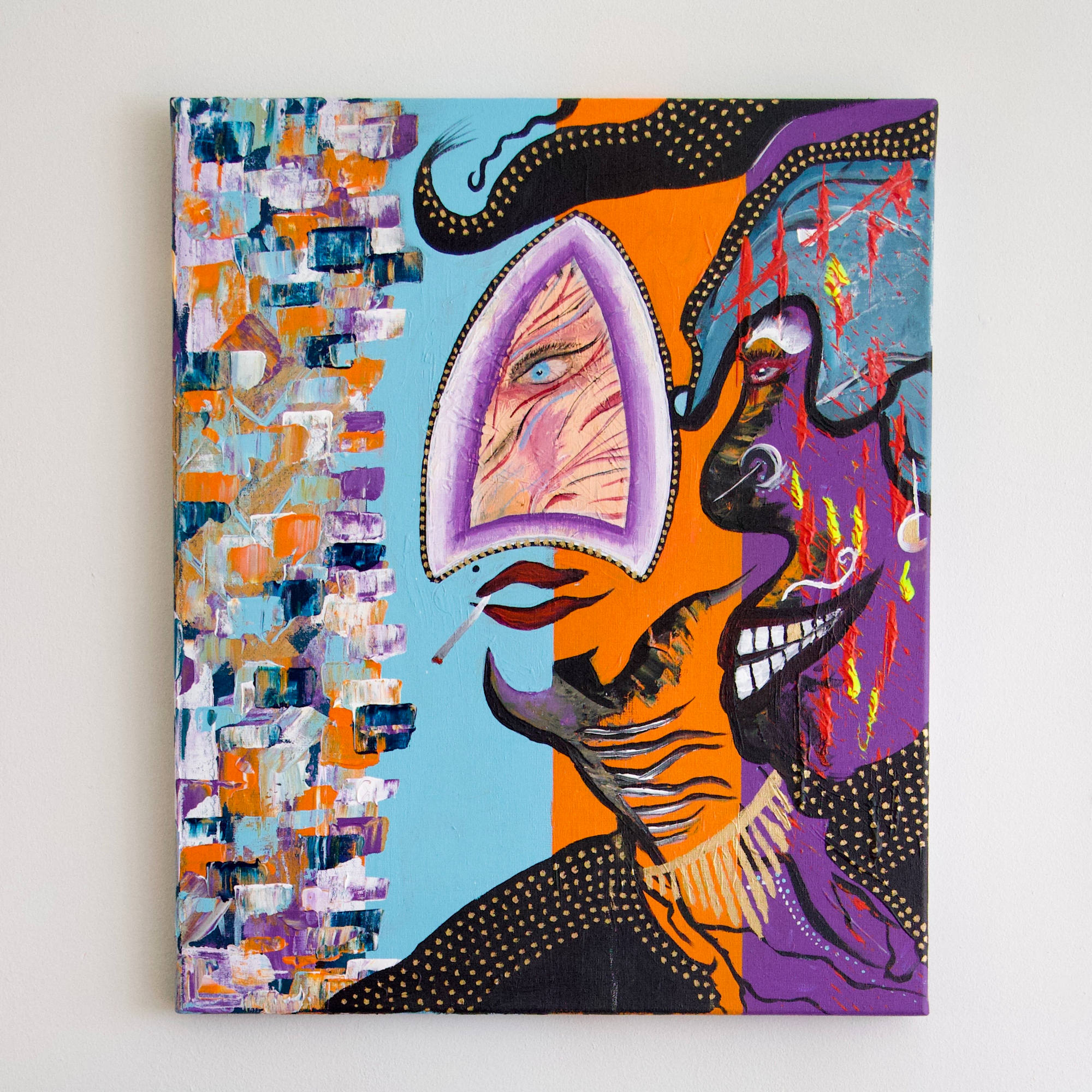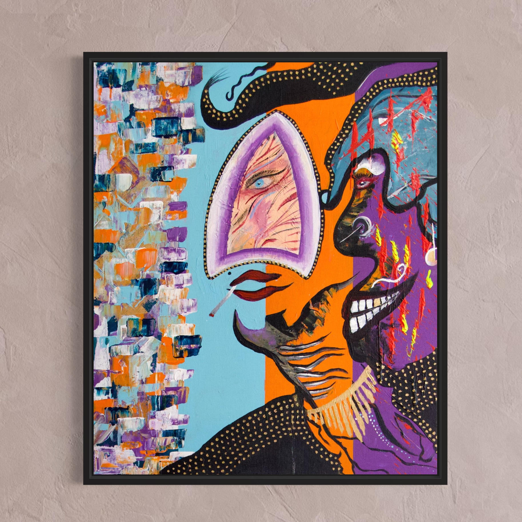 Eye See Us” is an original, hand-painted acrylic artwork on linen canvas. This painting is a visual journey through self-reflection and identity. The central eye serves as the observer, inviting a deeper introspection: Who am I, and how am I seen? The work explores the interplay between how we perceive and how we are perceived; between the inner world and the outer world.