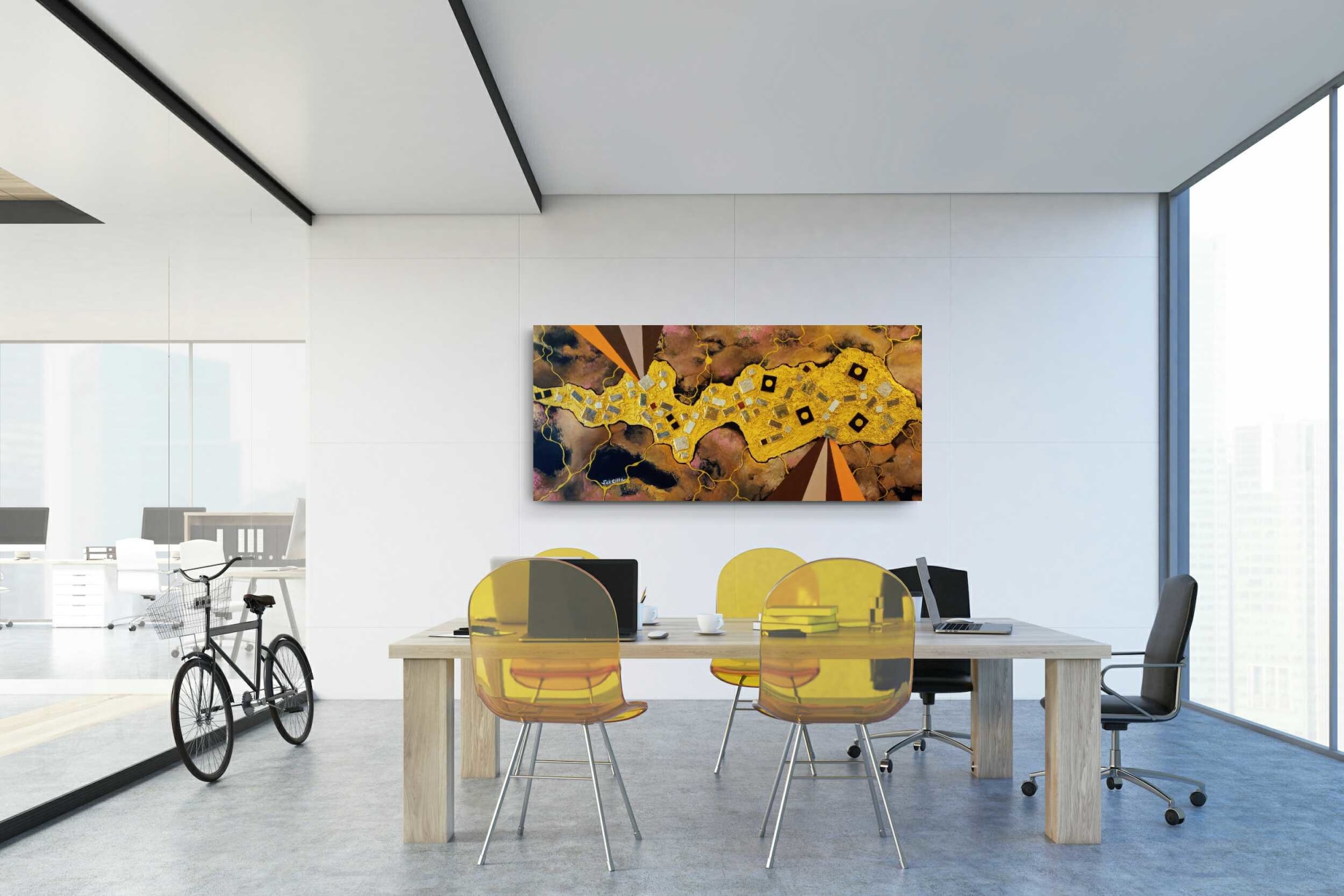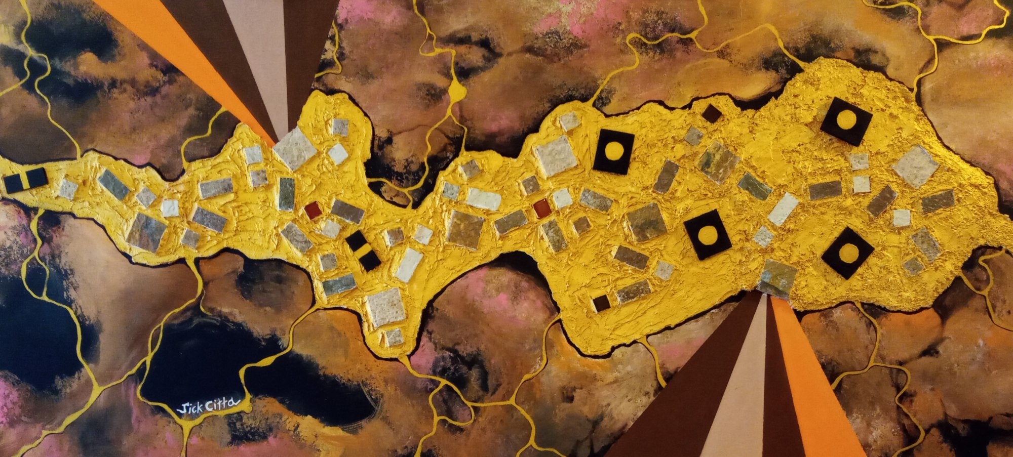 This painting came to life without much of any preconceived design, effect or technical thoughts. It came forth spontaneously and totally from a reactionary, emotional, inspirational base. However, I did have a plan to use modeling paste in this painting, and what is seen through the middle area, from left to right, is texture derived from a lot of modeling paste and some addition of granular, stucco like texture material. These materials formed the foundation of this central, and primary area. Also these materials were what was needed to mount and surround the mosaic tiles in random positions throughout this key area. I will say that I shaped and chose this key area to be a random, irregular shape, to appear more strong, gritty and unique.