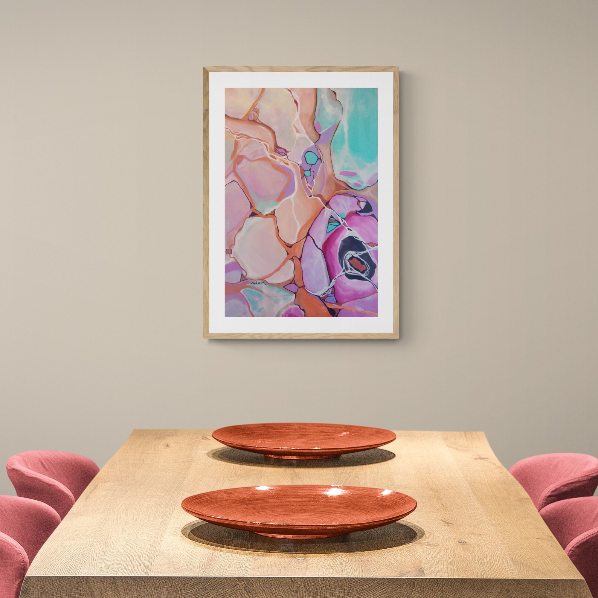 In this painting I found myself in a mindset of portraying perhaps a wall of stone or rocks like shapes but allowing most of the shapes to be large and boulder like. In my Stratageo collection I strive to be strongly semi real and more geological in my composition , adding some touches of realism. But in this painting I was deliberately adding many nebulous, lesser defined shapes. Thus I put it into my Abstract collection, not the Stratageo collection. I enjoyed the build up, structuring of this composition, keeping the areas and shapes loose and flowing, having the shapes fitting together, forming a light, pastel and soothing effect and composition. My followers responded well to my efforts and the end result, plus they really seemed to especially enjoy this particular painting.