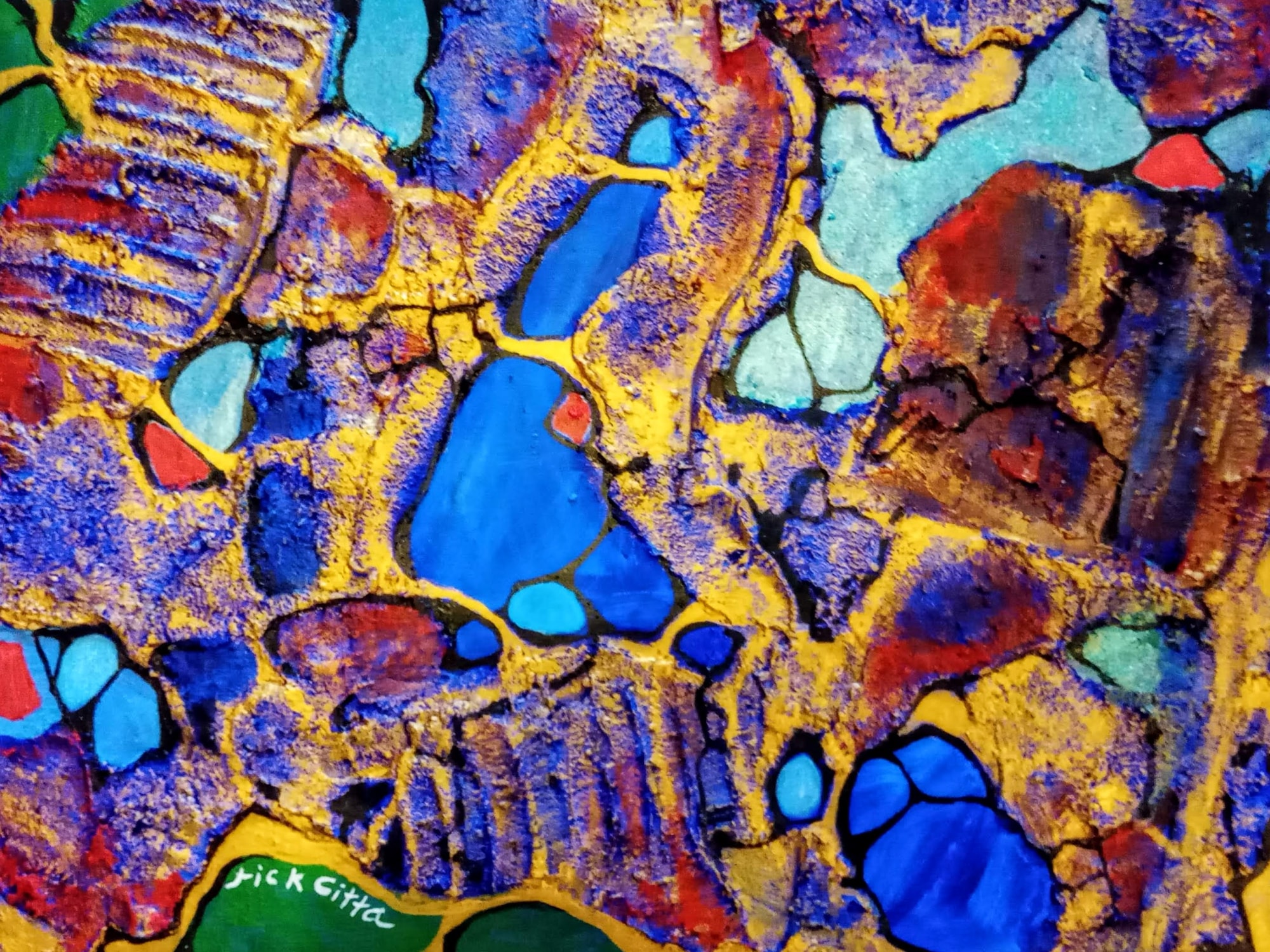 Rich and dimensional. Texture galore. This painting. If this appeals to you then I am happy. Working with a foundation of textural materials is very intriguing and dynamic. This painting, this creation, has simulated depth visually and in a physical, textural sense too. Very colorful, with vibrancy and strength.