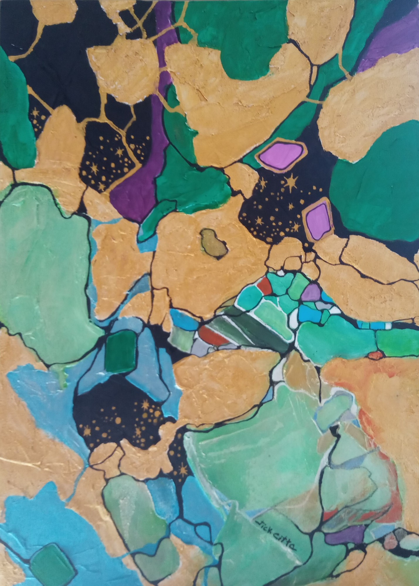 Perhaps you have noticed my affinity to metallics in my paint palette selection or in past viewings, promotions. Well, this painting features gold metallics. I often work with irregular shapes and flowing, encircling, connecting lines. The gold of course is very reflective, so much so that it can be a bit difficult to photograph. As well the textured areas, of which there are many, are a little tricky to fully capture in the photo too. But this photo transmits the important details fairly well, nonetheless.
