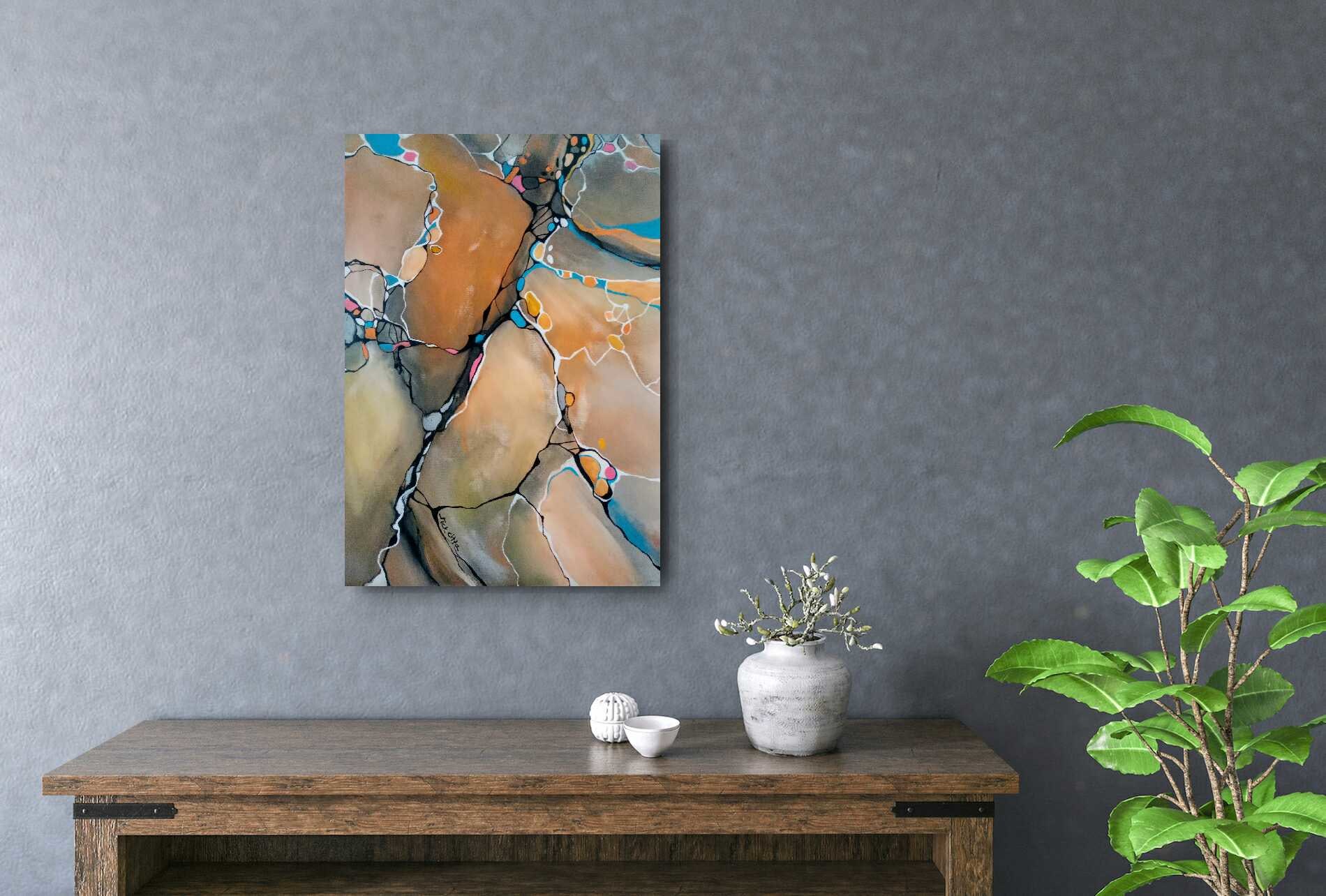 Caliente. Cuando comencé a pintar este cuadro, la paleta de colores se trasladó principalmente a la selección de tonos cálidos. Esta pintura tiene muchas formas grandes e irregulares, conectadas por líneas fluidas y formas pequeñas, ovaladas o circulares. De modo que las formas contrastantes se armonizaron y unificaron. Como gran parte de mi trabajo anterior, las influencias geológicas se infiltraron mientras pintaba. Decidí incluir esta pintura como parte de mi serie Stratageo, pero entendido cuenta de que el espectador también podía interpretar este abstracta de muchas otras formas no geológicas.