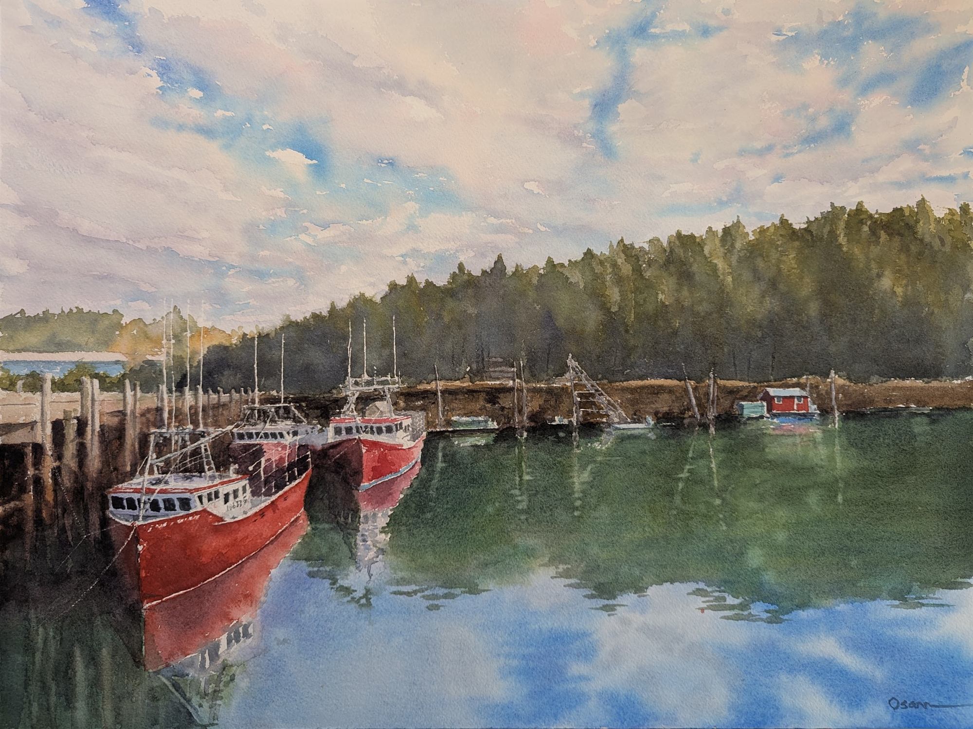 18x24 watercolor painting, sealed and surface mounted in a black floater frame. Fishing boats sit at rest in Campobello Harbor on a quiet afternoon, waiting for a busy day tomorrow.